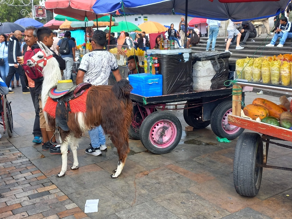 After exploring the interior of the cathedral, I emerged once again onto Plaza de Bolívar, where this Sunday afternoon, there were many people and a few llamas being used for taking pictures with tourists.