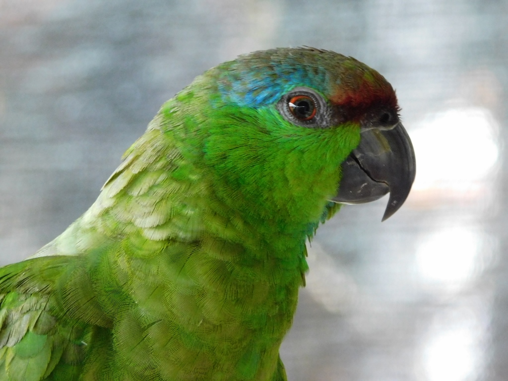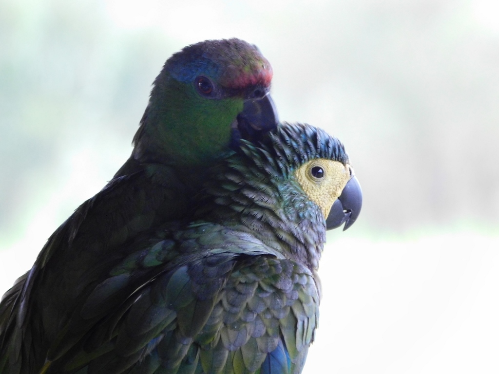 The video recording also shows a parrot perched on the railing near the neighbouring table. In fact, there were two of them belonging to two different species and they would occasionally fly off only to circle around and return. This gave me the opportunity to capture them on camera. In the next photo, on the left is the festive parrot (Amazona festiva), while on the right is the red-bellied macaw (Orthopsittaca manilatus).
