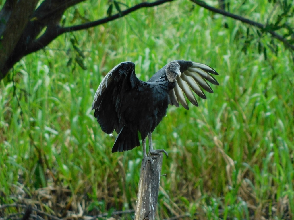 I contented myself with watching a whole flock of American black vultures perched on a nearby tree, waiting for the rain to pass.