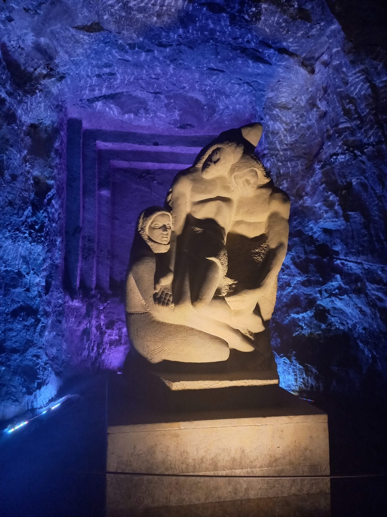 Here, on the right side, is the sculpture of the Pietà, which traditionally depicts the Virgin Mary cradling the dead Christ removed from the cross. What makes this version of the Pietà in the Salt Cathedral unique is that it includes three figures: Christ in the centre, Mary Magdalene on the left and Joseph of Arimathea on the right. Namely, all four Gospels mention that Joseph of Arimathea took down and buried Jesus' body after his crucifixion. As for the female figures, there are variations among the Gospels, but two also mention Mary Magdalene.