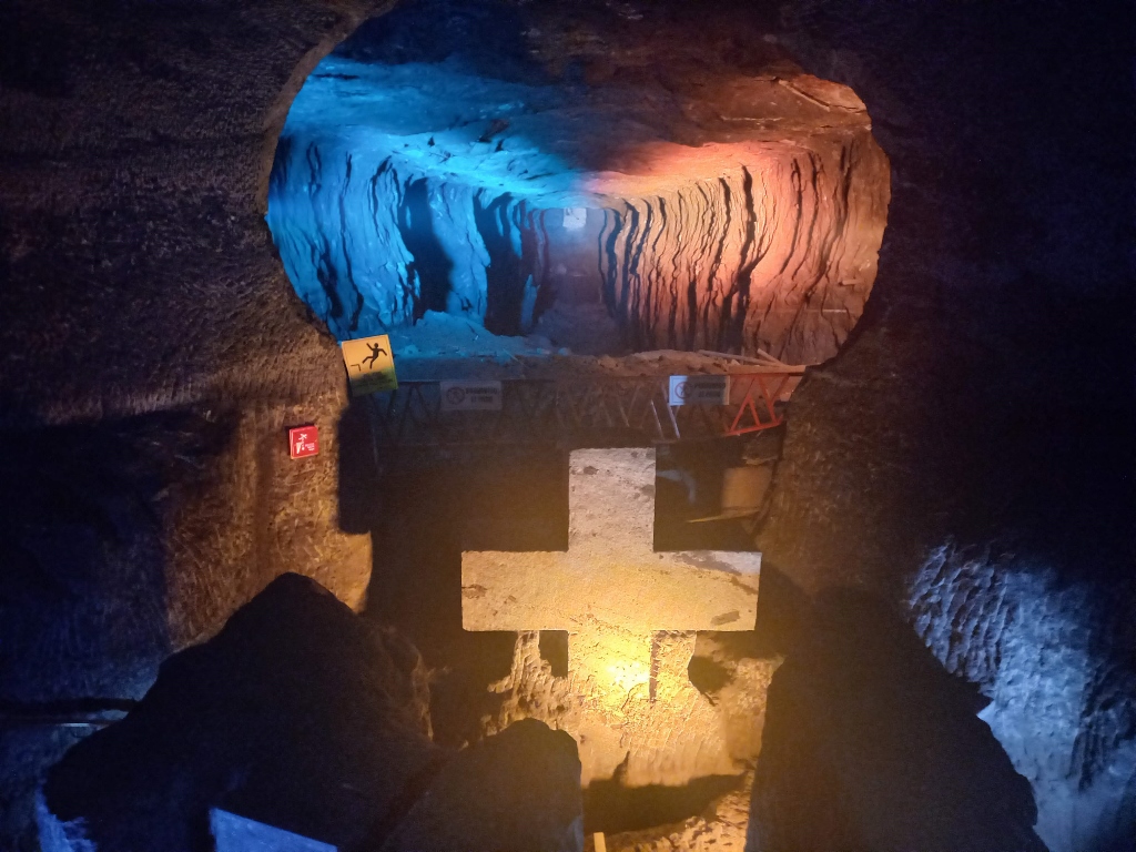 Yet, in the middle of the chaos of commercialism and the entirely nonsensical inclusion of the story of a historically insignificant Egyptian pharaoh, whose only "value" is that his tomb was found untouched and therefore full of gold objects (!!!), I found another (partially) interesting place. It is called the Water Mirror (Espejo de Agua). Here, there is a "pool" in the rock filled with water, illustrating the modern method of salt extraction from mines through dissolution in water and pumping. Since there are no activities in the water itself and no air currents or wind, the water surface is perfectly calm, creating a mirror effect that reflects the wooden platforms on the sides and the stone ceiling.