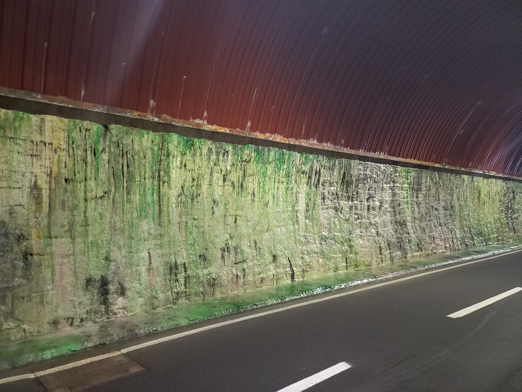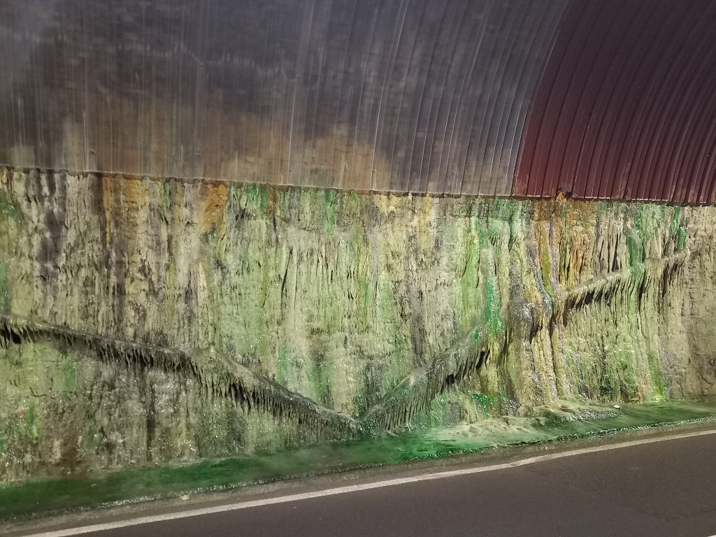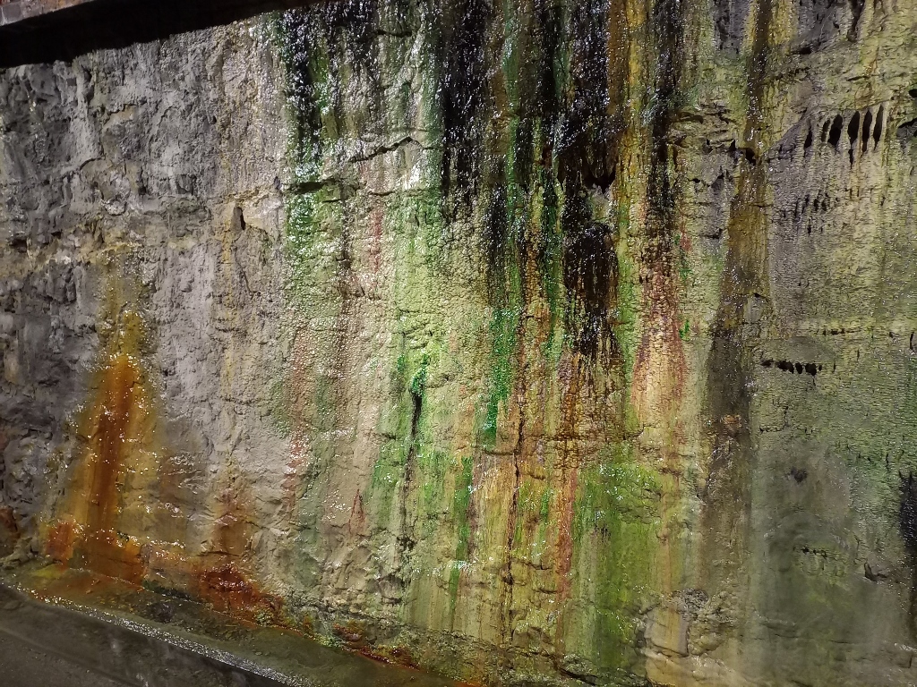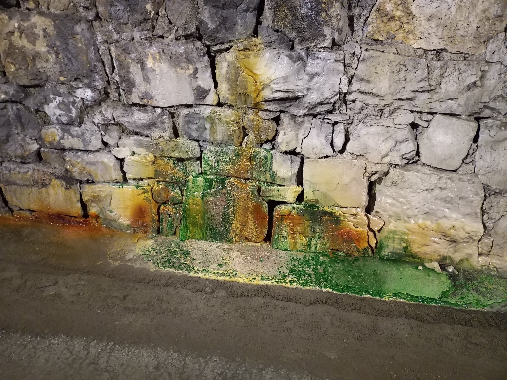 In several spots, water drips from beneath the metal covering on the ceiling, just a small amount, but quite steadily, and as it interacts with various metals, it forms different compounds and colours the tunnel walls. It all looks very intriguing.