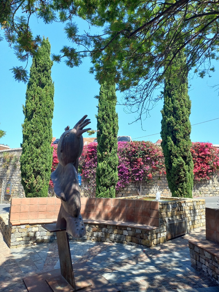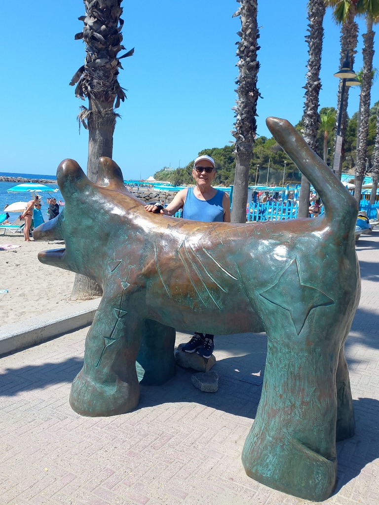 The promenade along the coast is nicely maintained and there was a sculpture where I took a photo of Francesco.