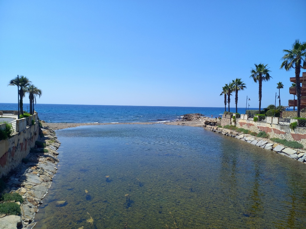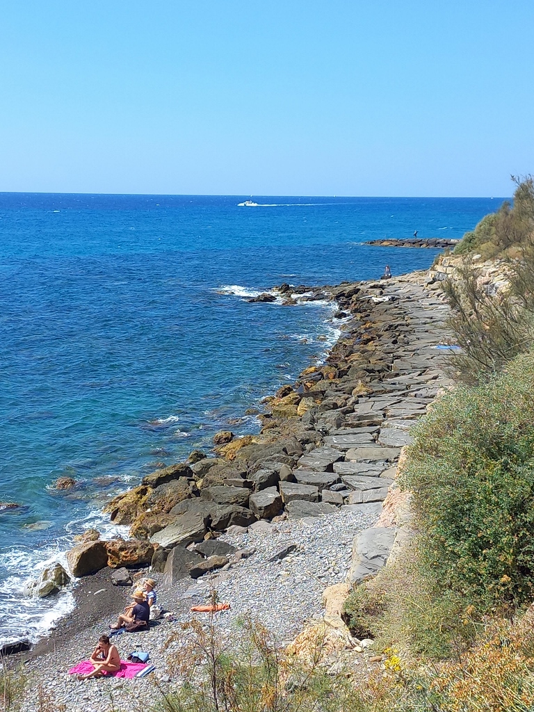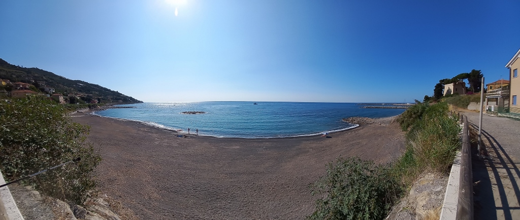 Now Francesco and I started heading back towards Riva Ligure. To begin, we went down to the shoreline itself and first crossed via a small bridge the San Lorenzo stream that at this time of year (second half of June) didn’t have enough water to overflow the embankment and flow into the Ligurian Sea.