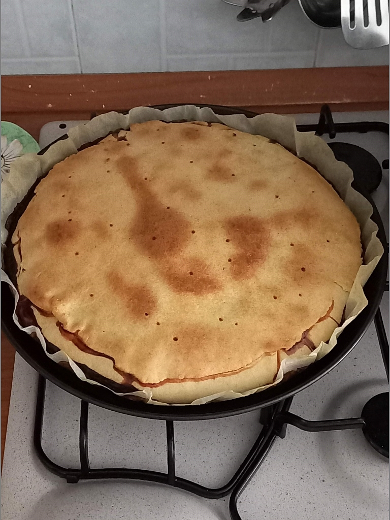 Divide the dough into two parts, one slightly larger for the base and the other a bit smaller for the top. Roll out the larger part of the dough thinly with a rolling pin and place it in a cake pan lined with baking paper, making sure the edges of the bottom dough slightly hang over the edge.