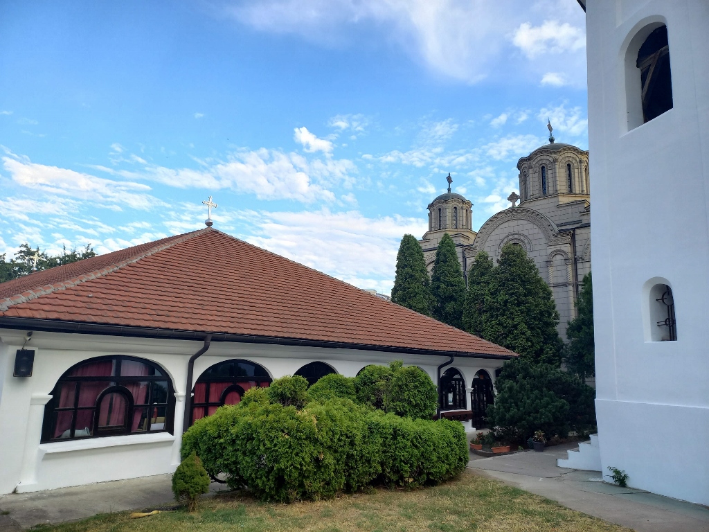 The churchyard shared by these two churches is located near the city’s main street, Bulevar Oslobođenja, which in this section is slightly widened by the sidewalks on both sides. At the time of my visit, these sidewalks were being renovated and newly paved. Likely because of this widened street area, this part of town is known as Široka čaršija (“Wide Bazaar Street”). During the Ottoman period, this area was actually the economic centre of the city.