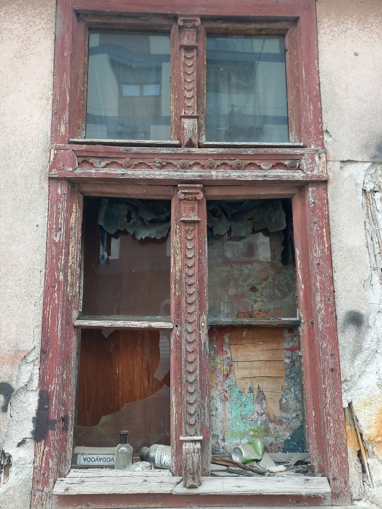 For example, the house shown in the next photo has very beautiful decorative window frames on the façade, at least what has survived. The house is for sale, so maybe someone will restore it.