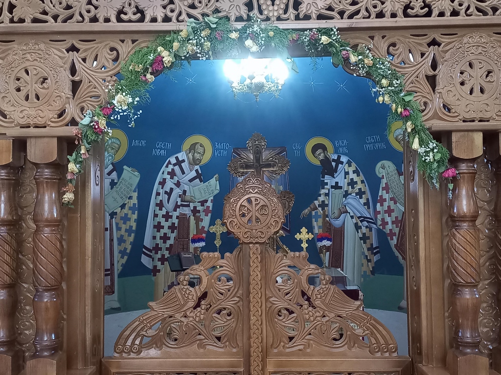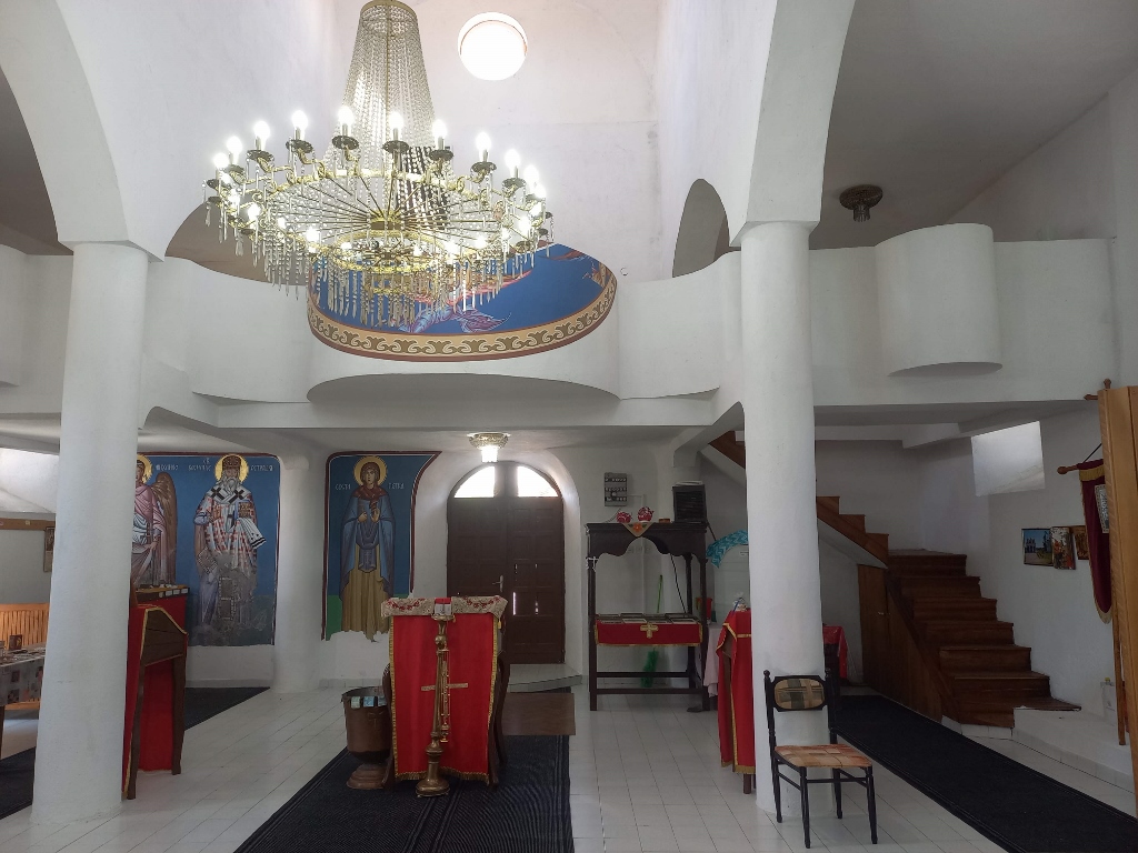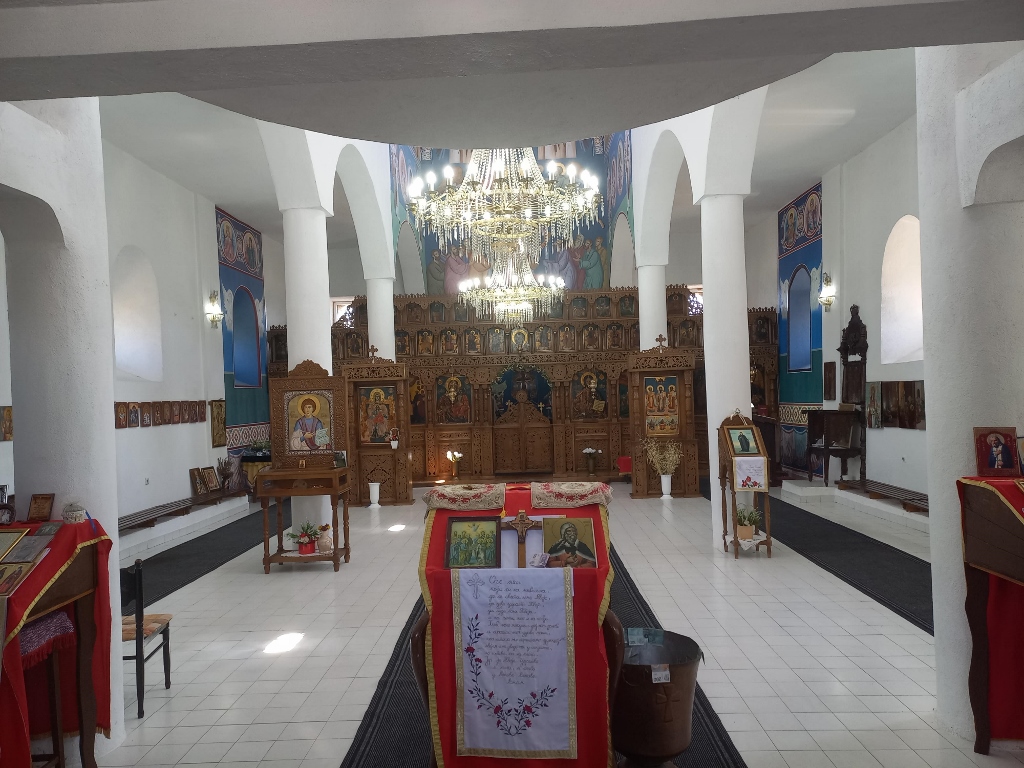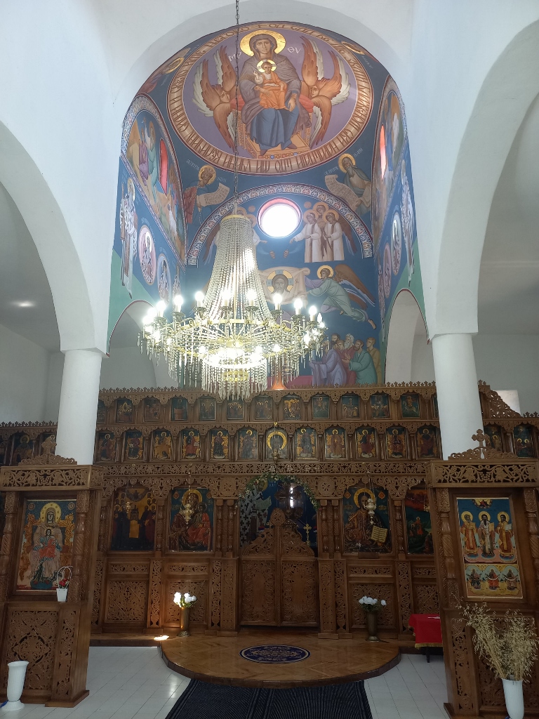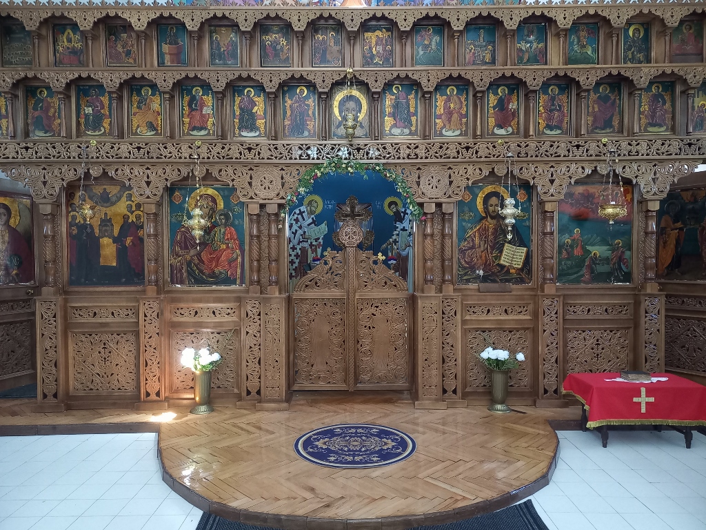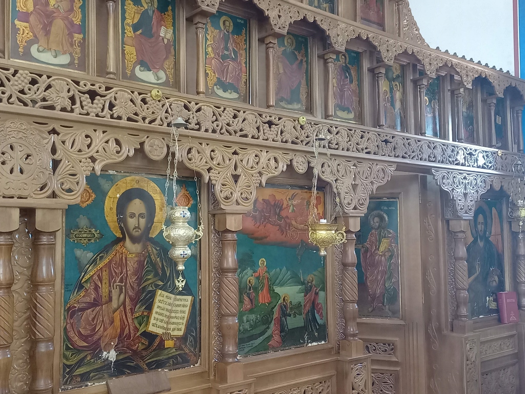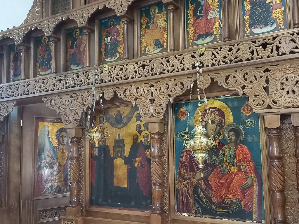 The central nave is vaulted with blind domes, while the entire width of the naos is separated from the altar area by a very beautiful wooden iconostasis carved in relief.