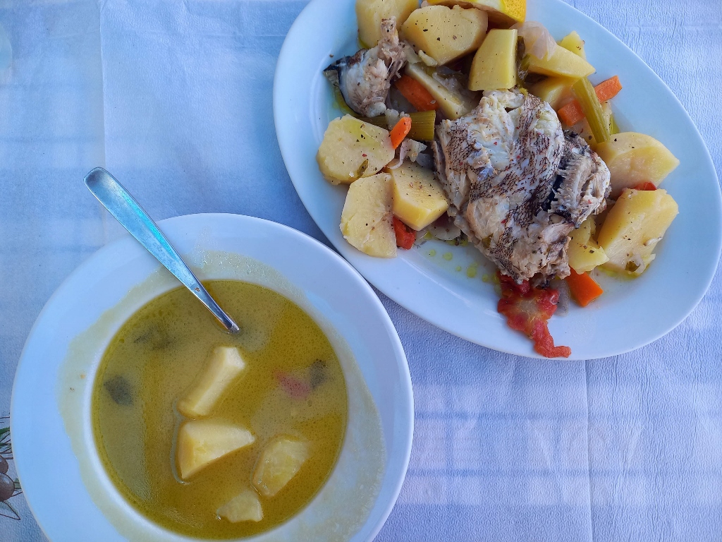 This time, I listened to the restaurant owner who recommended the fish soup because it was made from fresh fish. I usually don’t order fish soups, but this one was truly excellent and quite plentiful. In the end, I also got some fresh figs for free, which I enjoyed immensely. I didn’t take a picture of them, but here’s the soup and the main dish (some freshly caught fish).