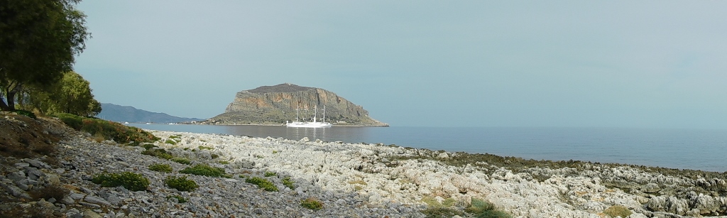 I stopped briefly as I approached Monemvasia because I saw a large white sailing ship docked there. As I later realised, it was a modern cruise ship designed to look like a sailing vessel. It looked very beautiful and only enhanced the view of Monemvasia even more.