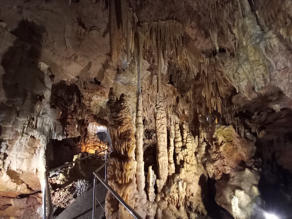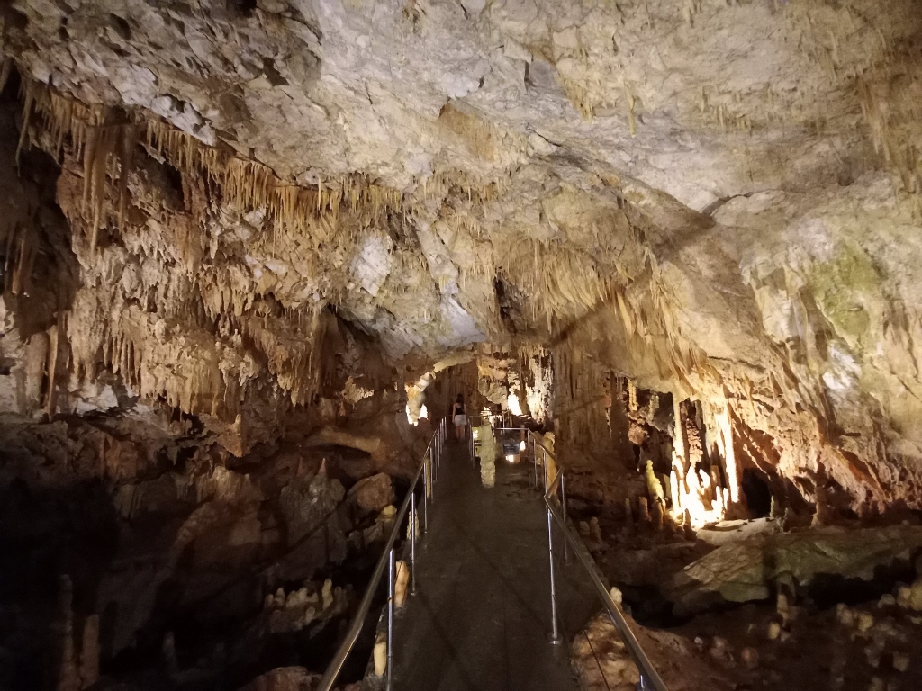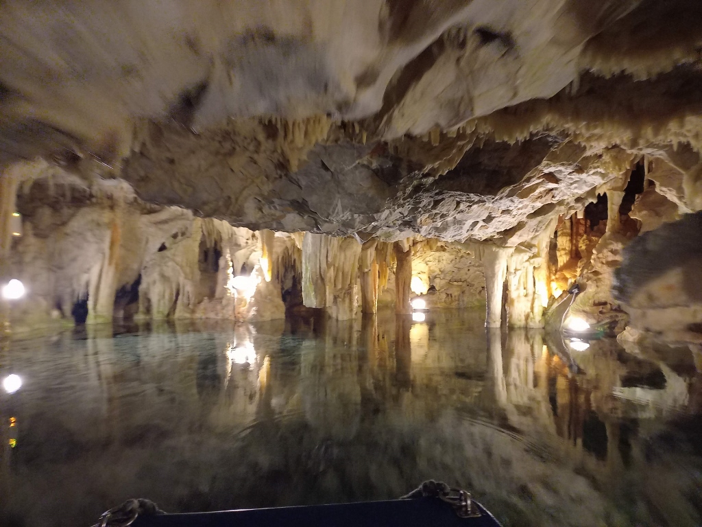 They consist of a series of halls filled with cave formations that have been carved by a river flowing underground through the limestone of the Mani Peninsula on its way to the sea. Today, this is one of the popular tourist spots in this part of Greece and everything is quite well organised. You purchase a ticket and then descend a set of stairs to a spot from which boats depart, after which you take a leisurely boat tour through about 2 km of the caves.