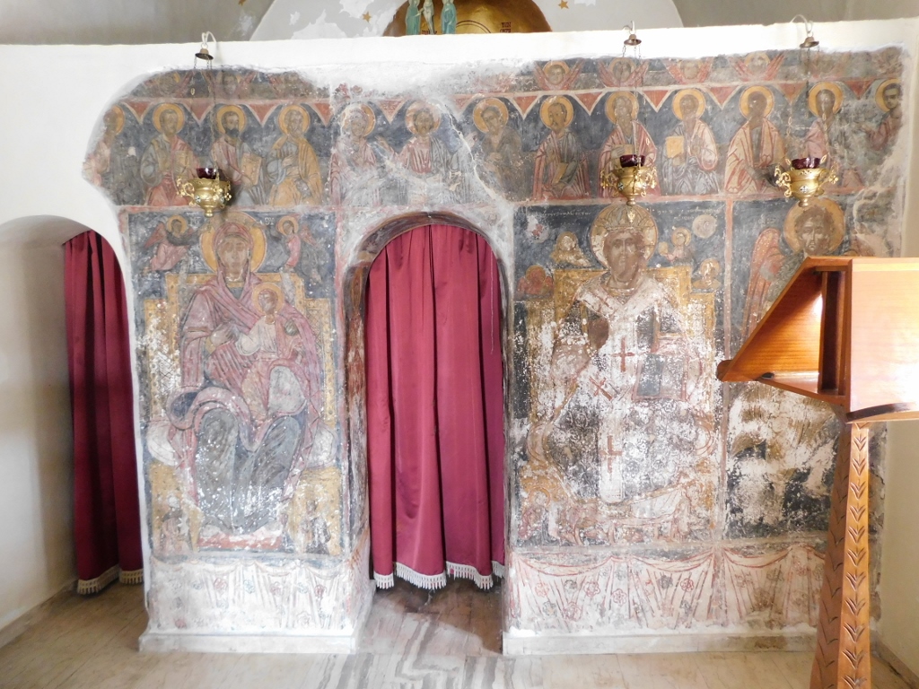 The monastery is known for its very beautiful frescoes, but since everything was closed, I couldn't see them. I even took a little walk around the monastery and peeked into the garden area, but I didn't spot anyone. The only thing I could do was take a photo of the three niches above the gate, where small and quite faded frescoes can be seen.