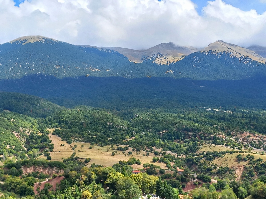 After visiting the Cave of the Lakes, about 4 km further, the road descends into a beautiful flat valley, before starting to climb again. It was precisely in this section that I came across one of those widened areas, so I parked there. From what I saw on the map, the main settlement in the valley is the village of Kato Lousoi, while further away, I could see parts of Mount Chelmos, the highest peak of which rises to 2,355 m above sea level. I had actually come from that direction.