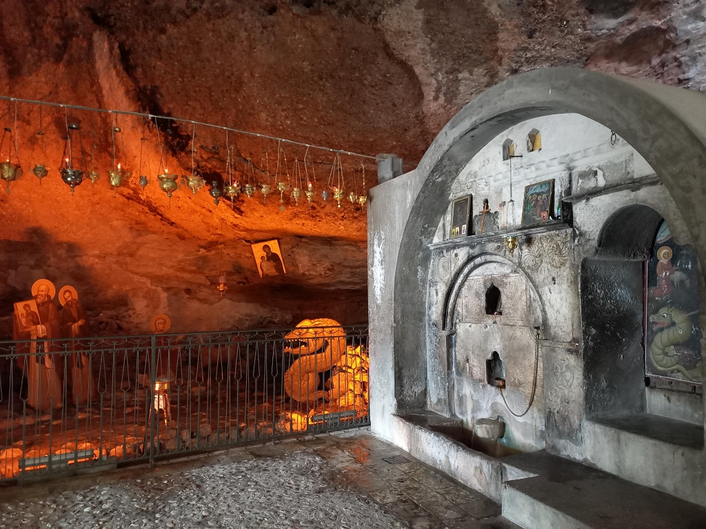 These buildings practically "conceal" the cave and in order to reach it, one must first pass through the modern parts of the monastery.