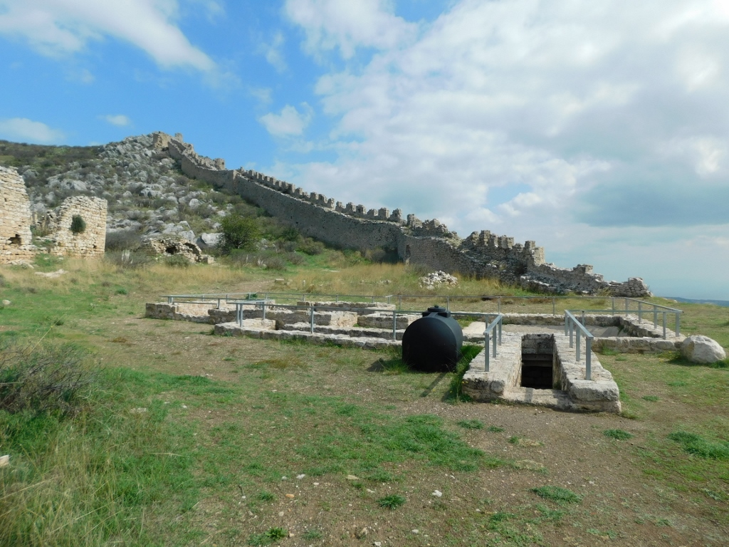 Today, here, buried in the ground, you can see the remains of a Hellenistic structure, with some Roman elements, and certainly others must have added to it over time, as the spring still provides water year-round. For any fortress, a regular water supply was of crucial importance. In any case, I took a pleasant walk there. On the left side of the previous photo, you can see a part of the Venetian barracks, while further along, parts of the ramparts are visible.