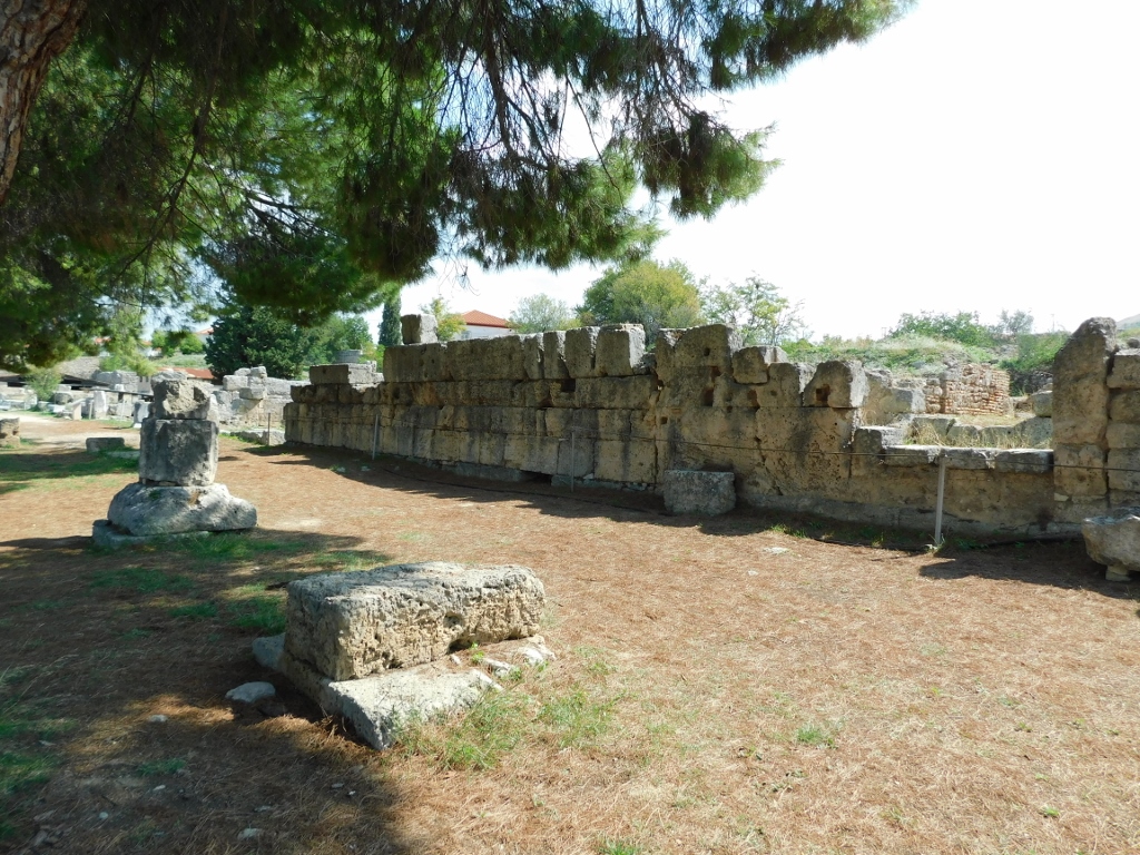 The South Stoa, from the late 4th century BCE, was a large structure that the ancient Greeks used to house guests, while the Romans later established their administrative centre there. It was a massive building (164.38 m x 25.15 m) that had a portico, or colonnade, along its front (longer) side, consisting of 71 Doric columns, while in the middle there were 34 Ionic columns. The stoa was abandoned in the 6th century CE.
