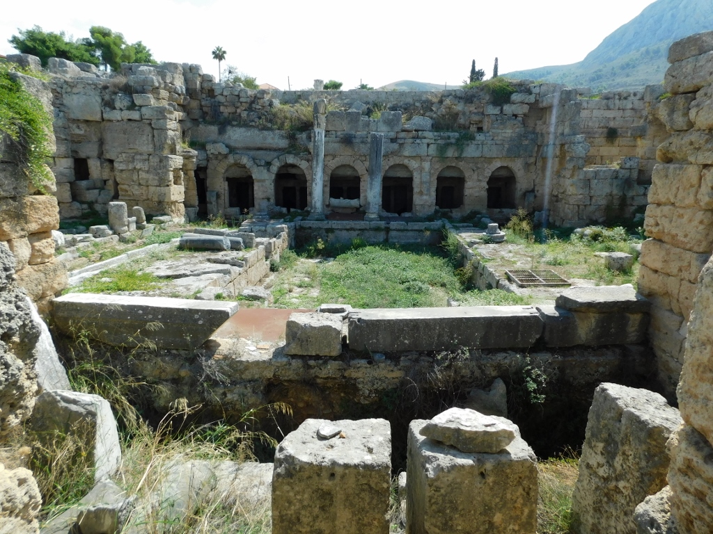 From the plateau in front of the remains of the basilica, you can also see the much better-preserved remains of the Peirene Fountain, and here runs the Lechaion Road, which was actually the cardo maximus of Roman Corinth – the main street running north-south, also connecting Corinth with the coastline.
