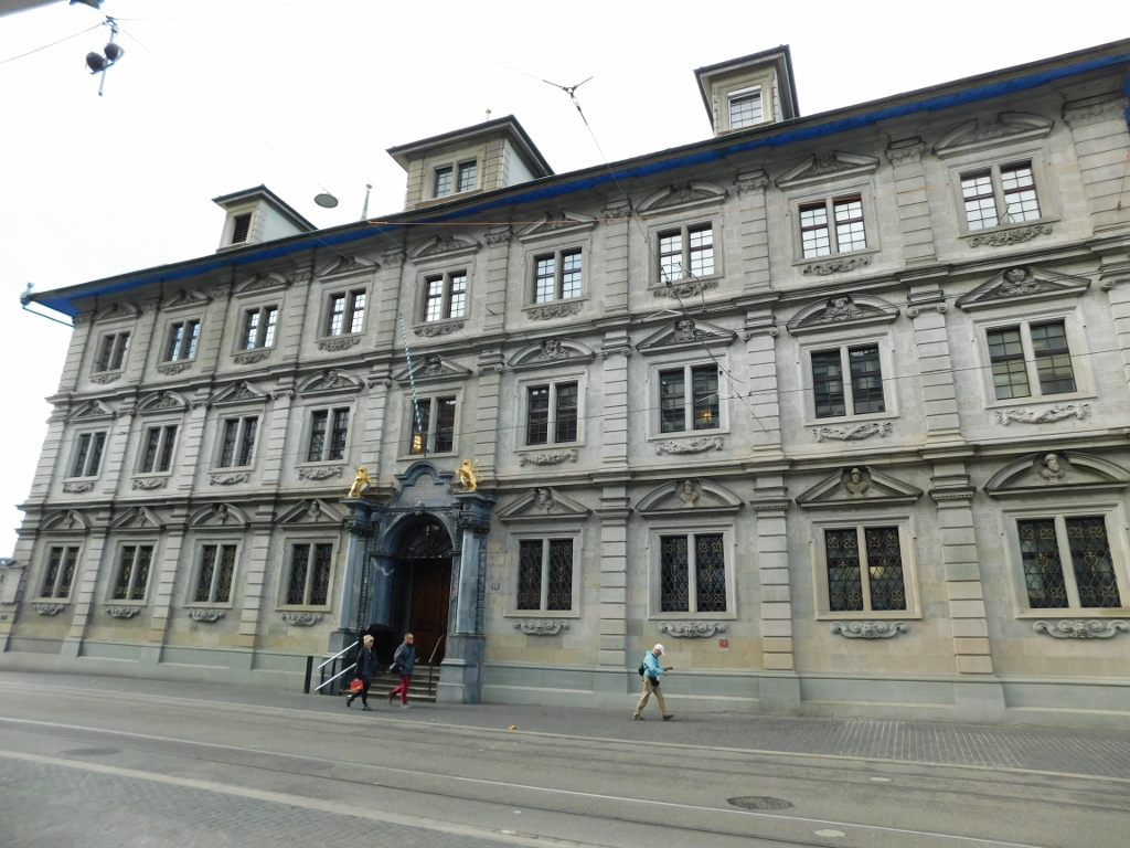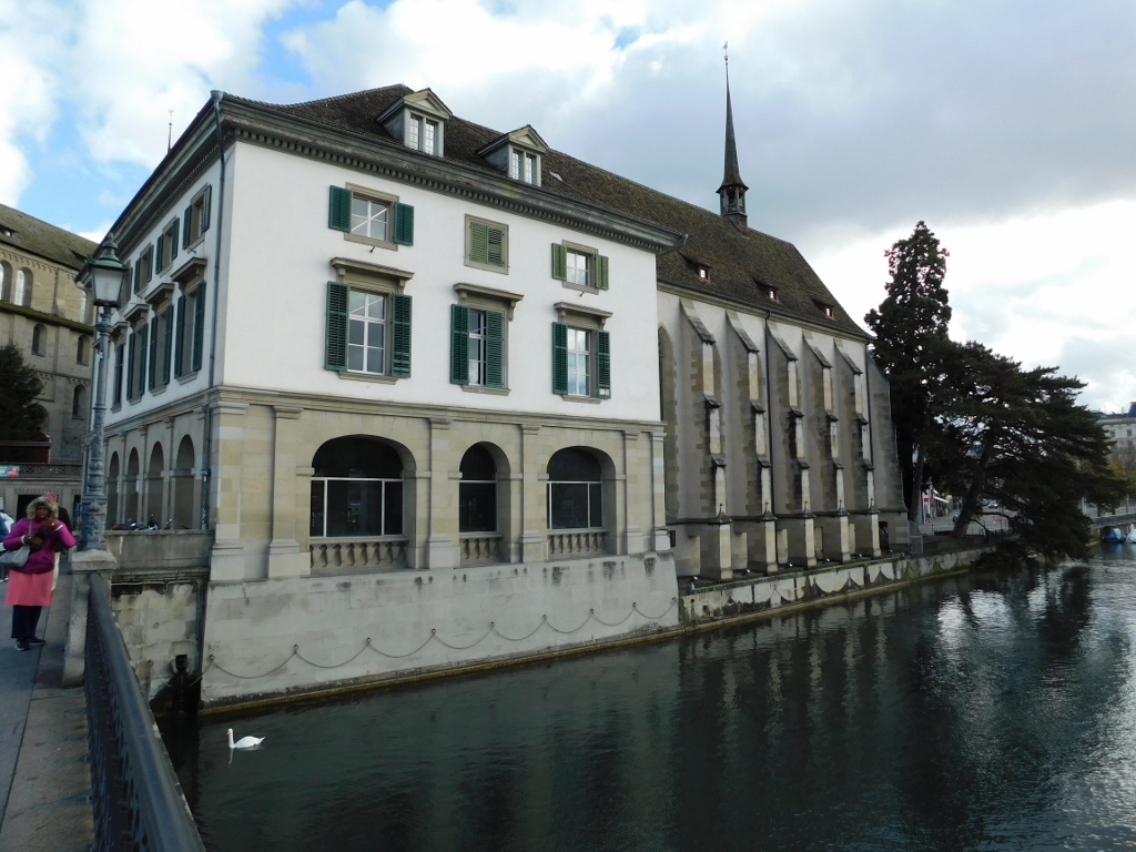 These two connected buildings, Helmhaus and Wasserkirche, can be seen much better from the bridge or at least from the opposite bank of the river.