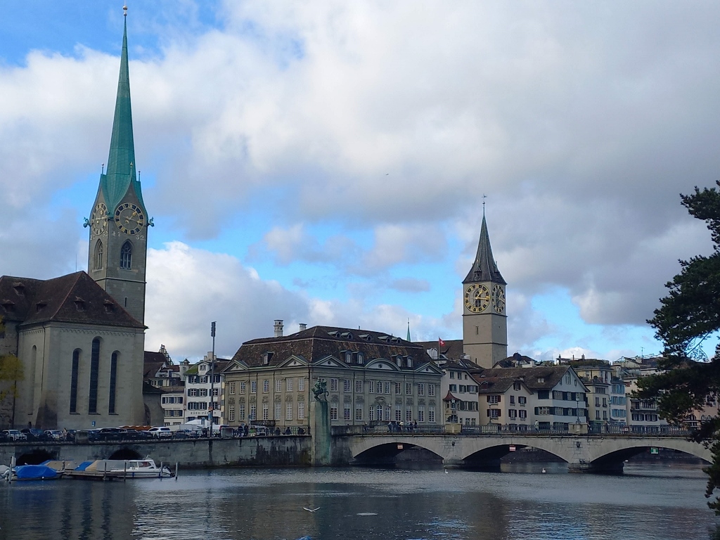 From the bridge, I had a great view of the downstream flow of the Limmat River, as well as the parts of Zurich that I had already passed through, which include some of the city's landmarks – St. Peter’s Church, the Town Hall, and the Cathedral.