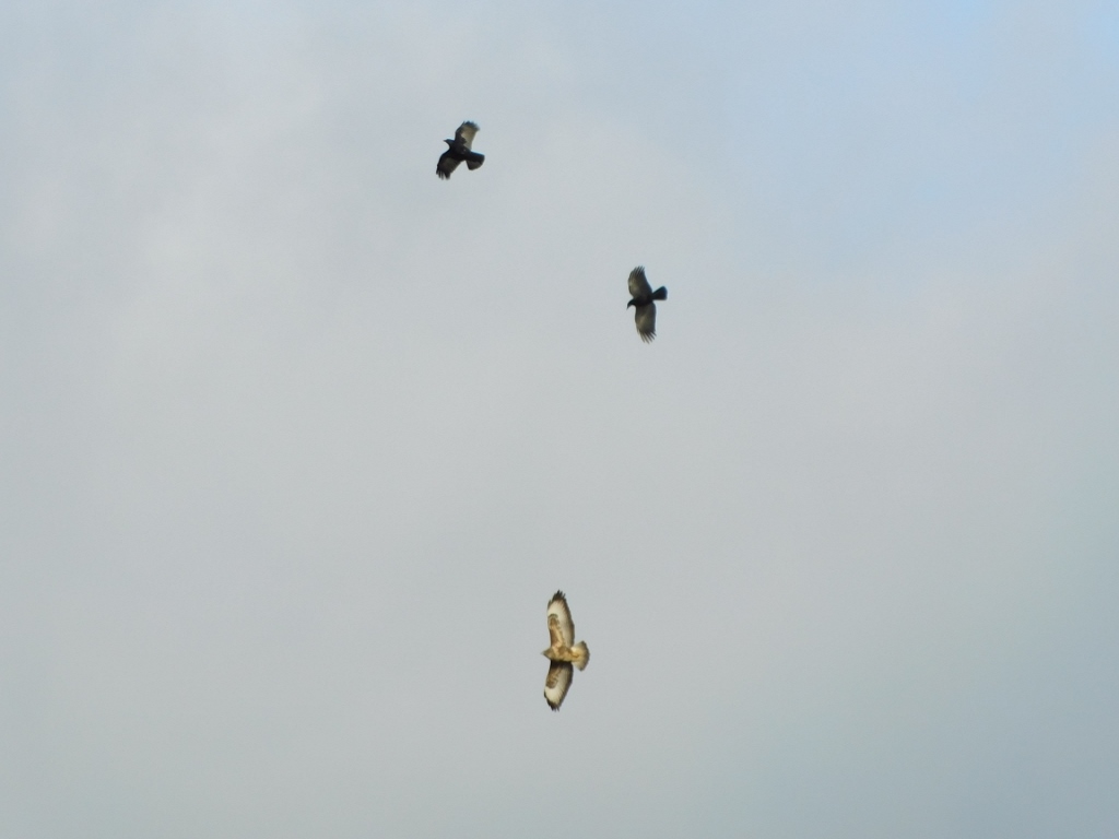 I made my way to the train station and as I approached, I noticed a couple of large birds of prey in the sky. I was impressed that they were flying relatively low above the centre of a large city. As I pulled out my camera and prepared to try to photograph them, they flew a bit further away, but as I moved, I saw one coming back in my direction. Moreover, I realised that a whole drama was unfolding in the sky, as this one bird of prey, which I later learned was a common buzzard (Buteo buteo), was fighting with two crows. I suppose the crows were driving the buzzard away from near their nest.