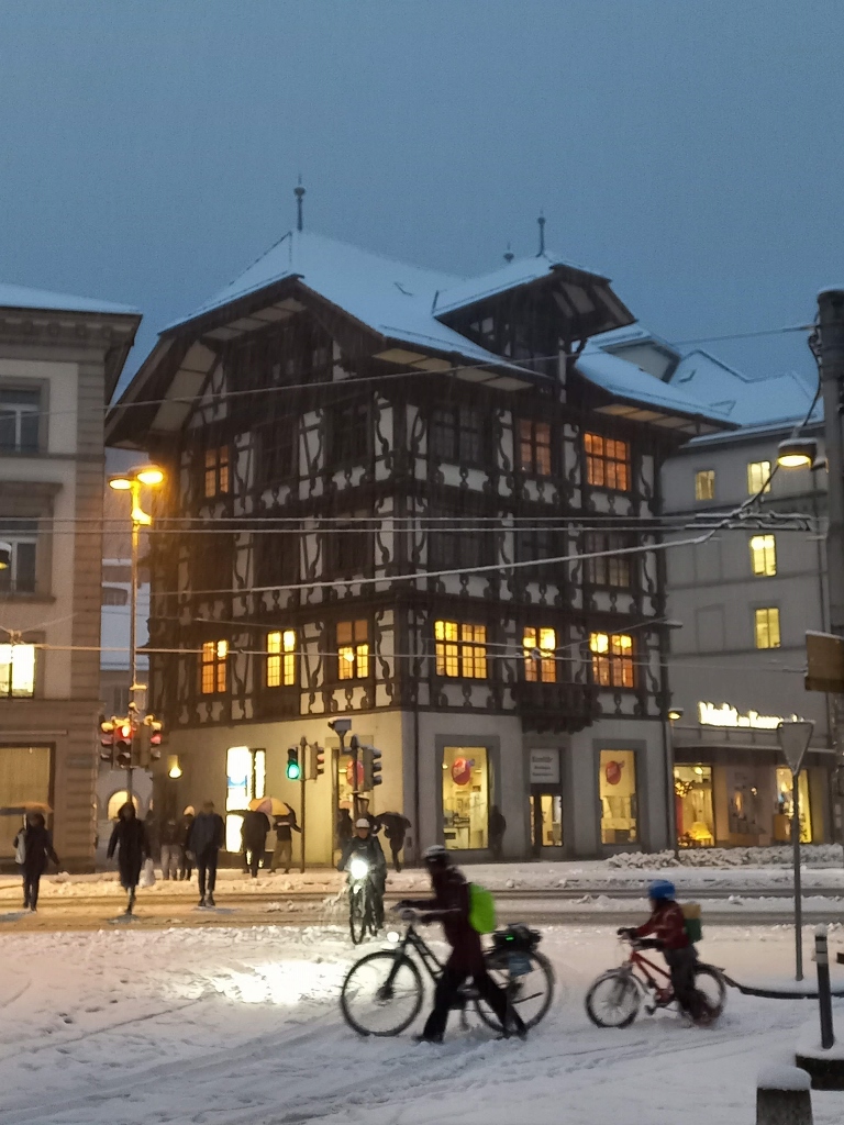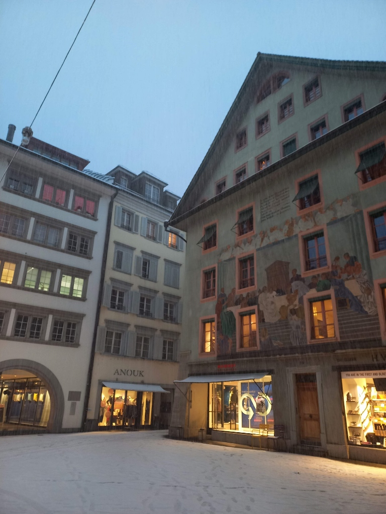 The Old Town in Lucerne is known for its buildings whose facades are decorated with murals. Not all buildings are decorated like this, but there are many and they truly look very beautiful. A partial problem I faced was the snow that was falling intensely, so I had to find places where I could briefly shelter myself so that the snow wouldn’t wet the camera or the phone, as then I would see more of a wet spot than what I actually wanted to photograph.