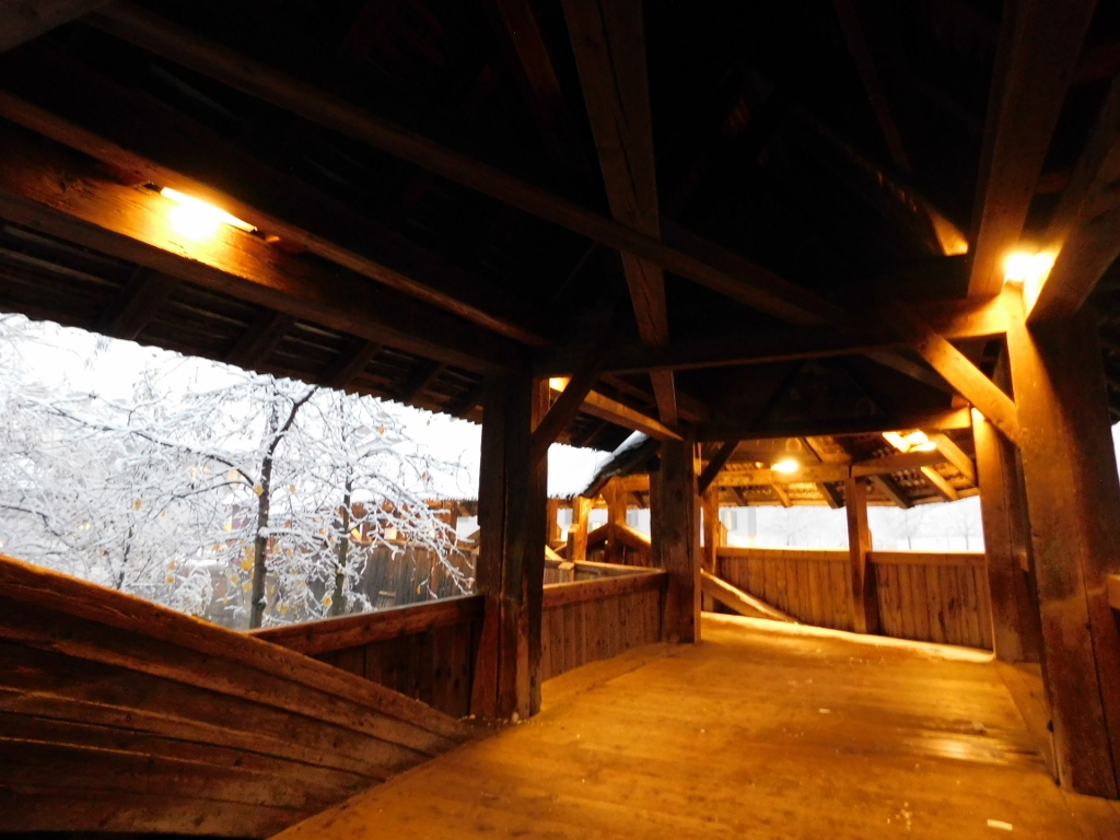At the very entrance to the covered part of the bridge, there is a very beautiful medallion, which I barely managed to photograph because of the snow that was falling intensely.