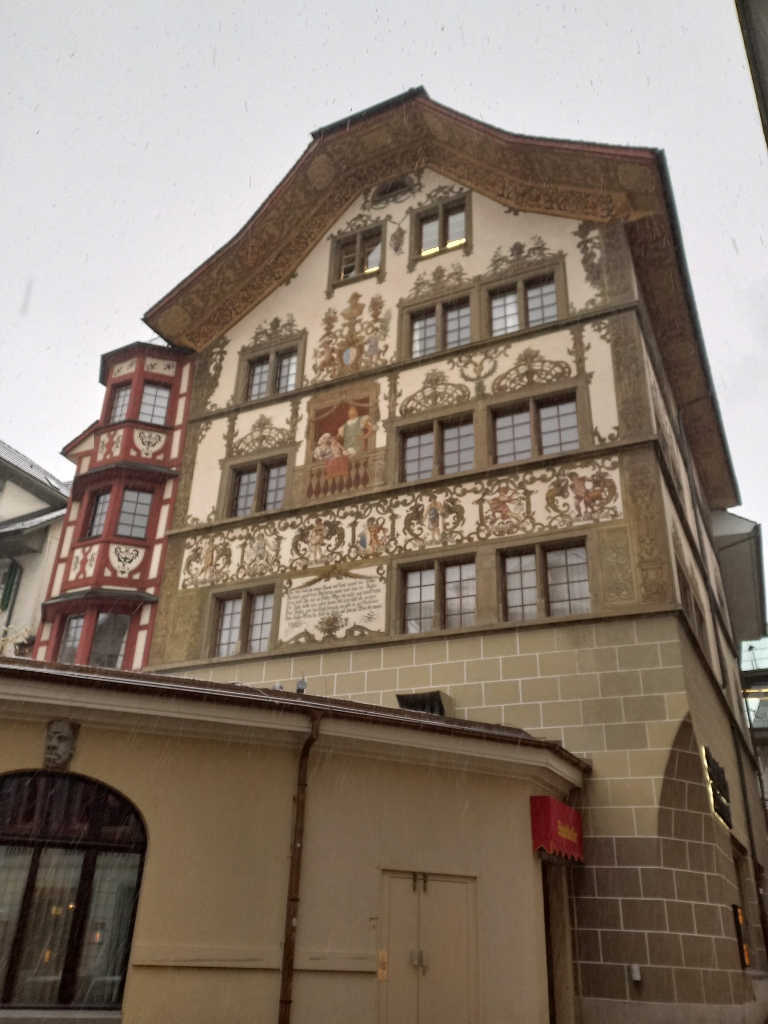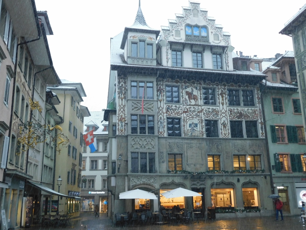 The charm of old Lucerne is contributed to not only by these painted buildings, but also by the streets and squares themselves. So, I came to Hirschenplatz square, and here I had to step into an entrance that led to a shop, just to be a little protected from the snow blown by the wind.
