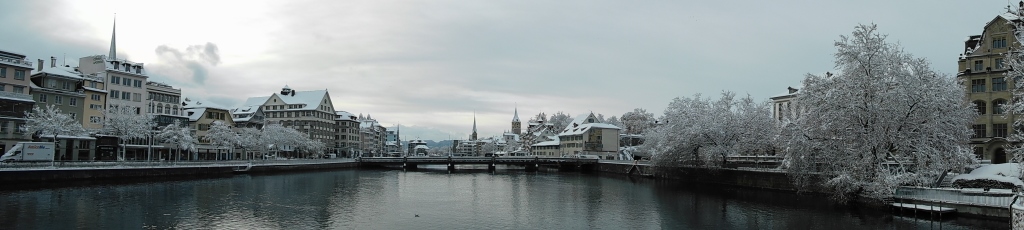 The simplest and most direct route to the station was via the pedestrian bridge over the Limmat River in Zurich and since it had snowed the previous day, the views were very beautiful.