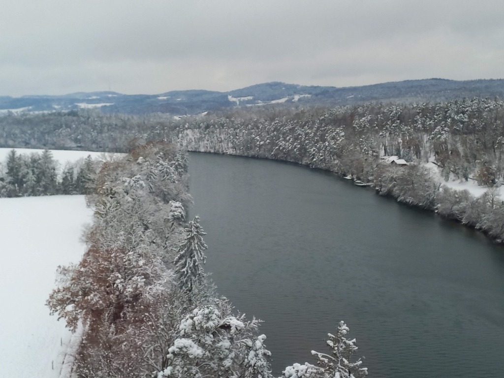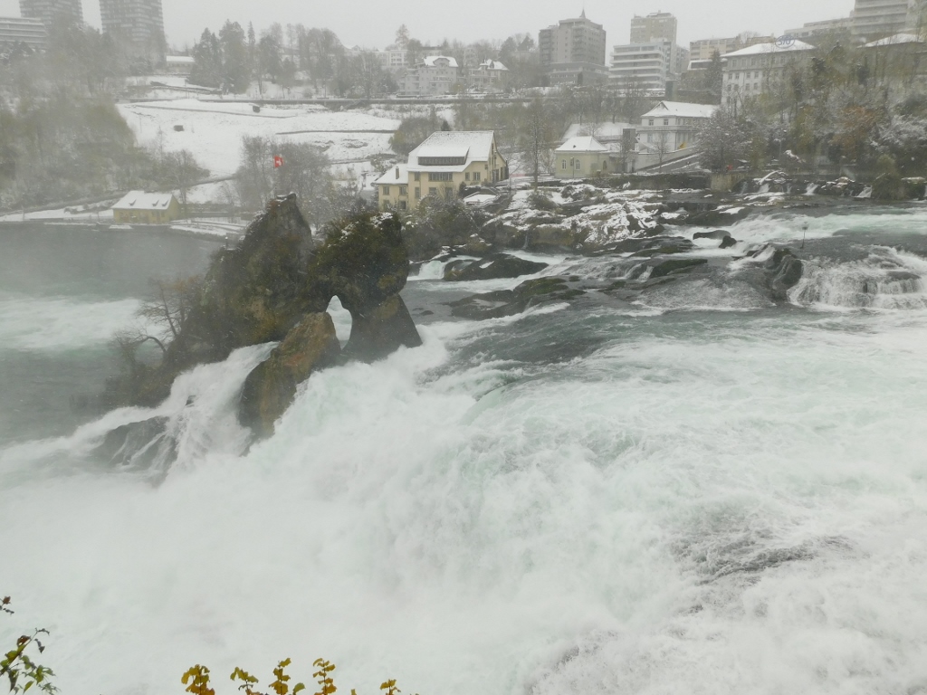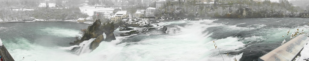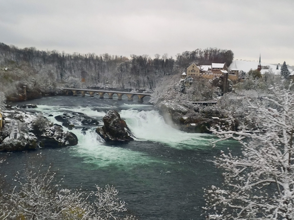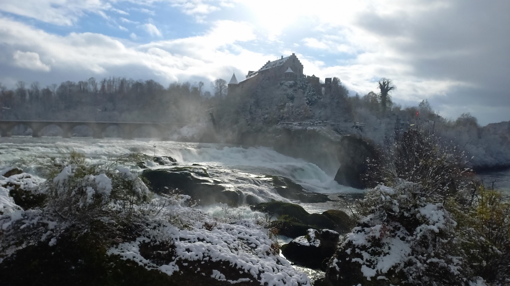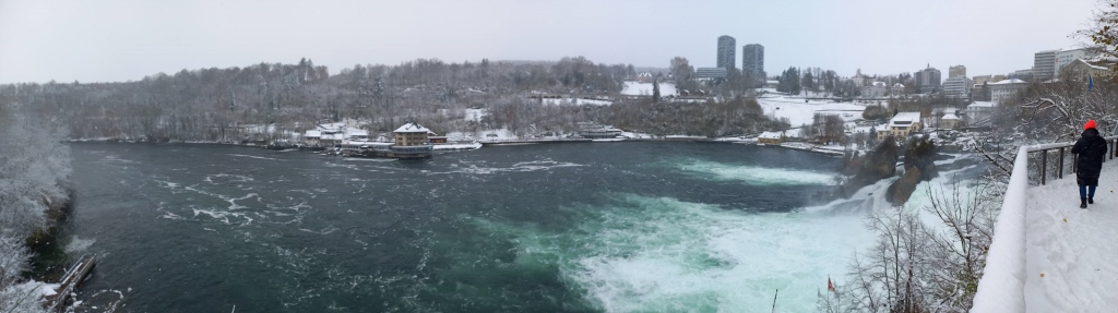 The only thing I could add is that by then, snow had started to fall more intensely. It was fine, but still it was quite a heavy snowfall. However, I managed to make a few video clips, which I compiled into a short recording from the left bank of the Rhine. In the video, you can not only see the powerful waterfalls, but also how heavily the snow is falling and how the platforms on this side of the river are set up, where it almost feels like you could touch the river with your hand.