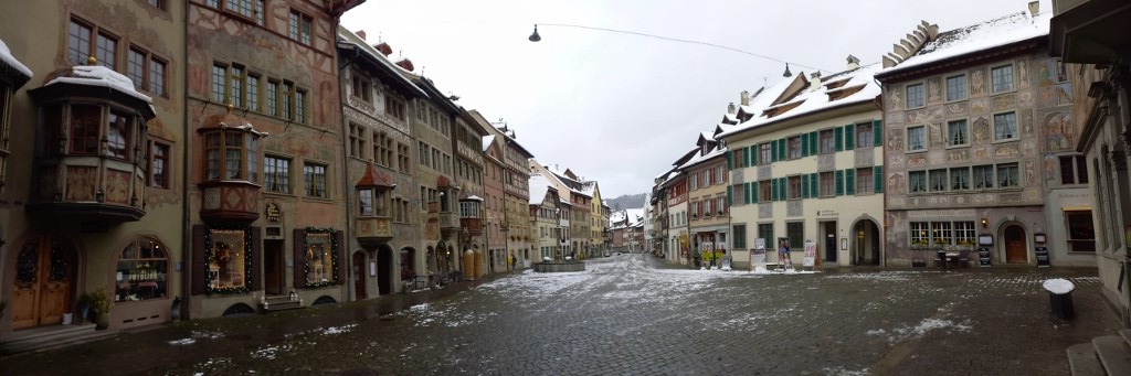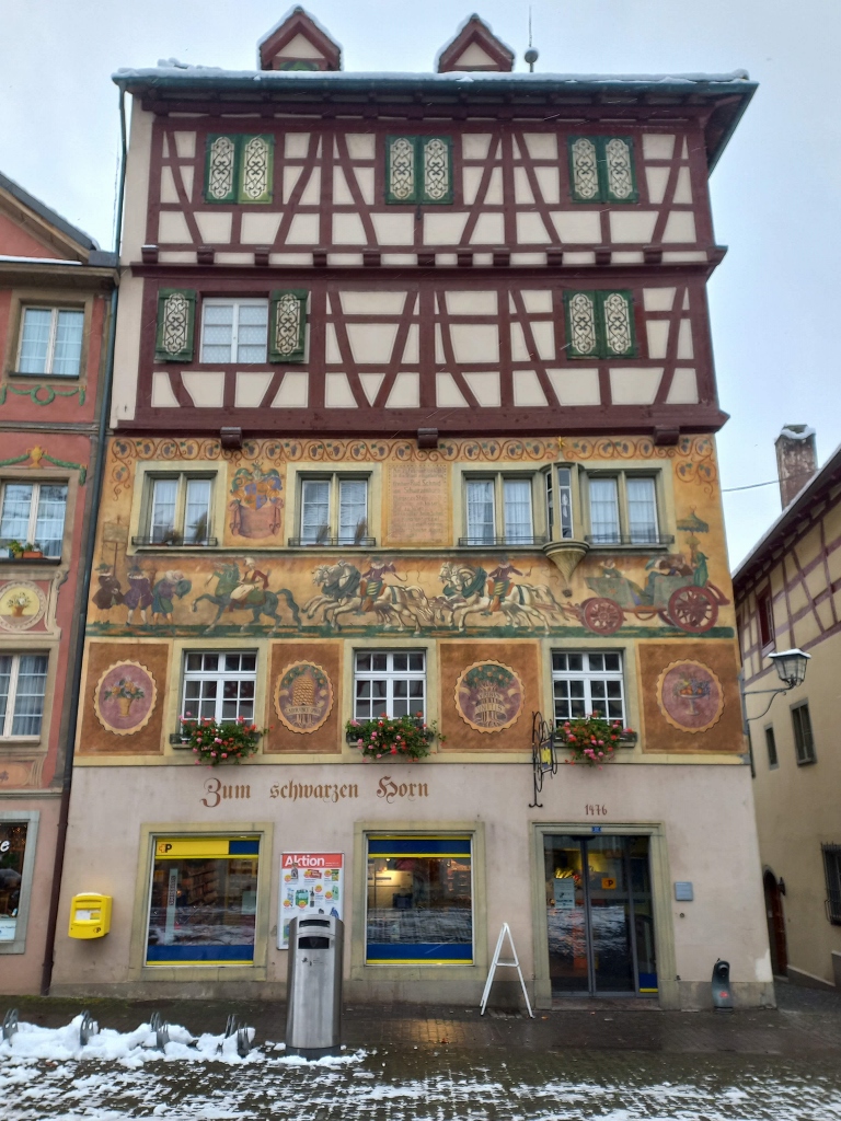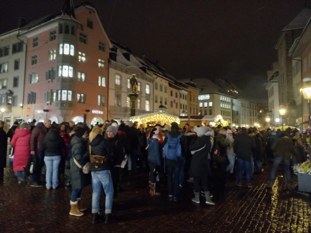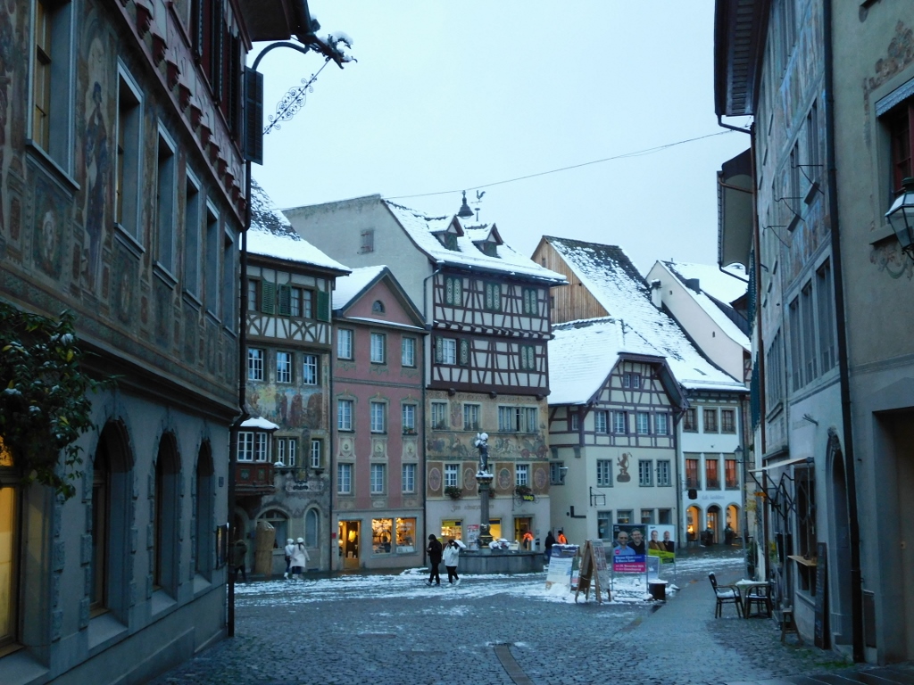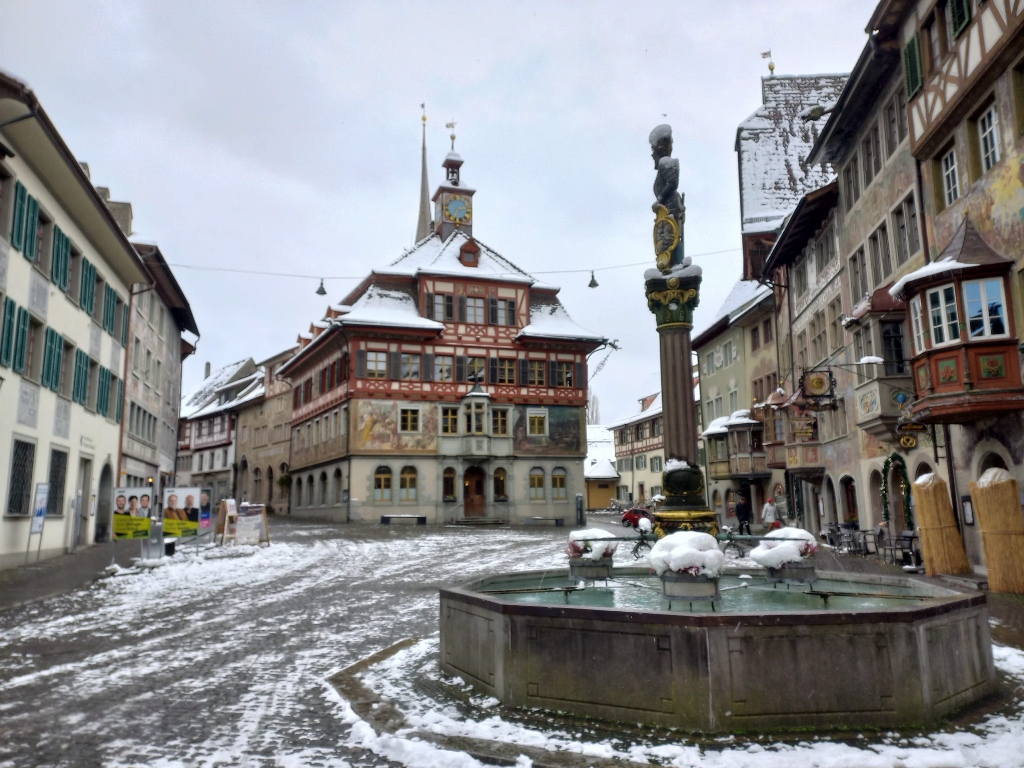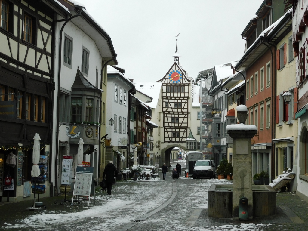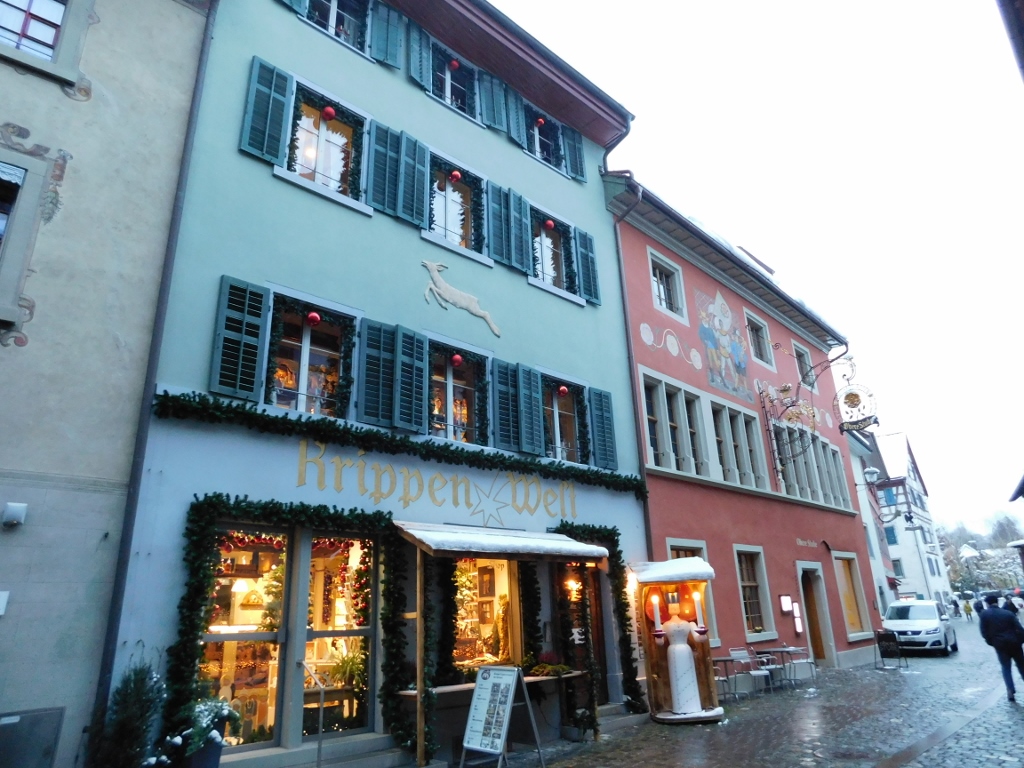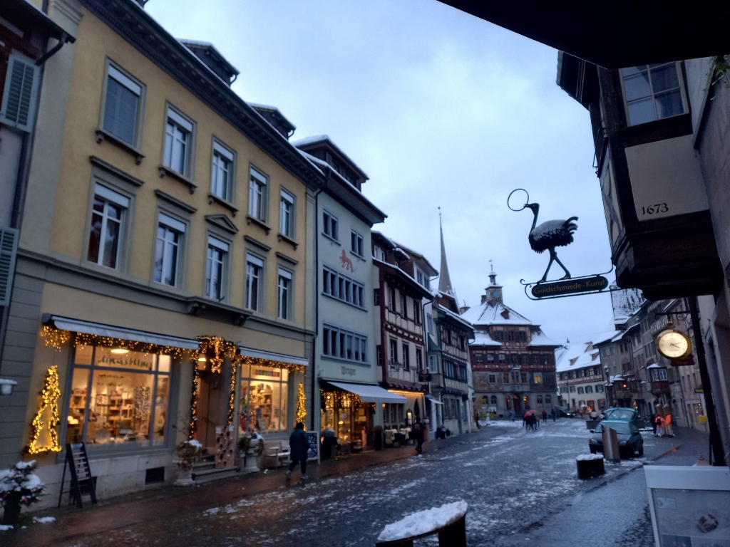 Since I was going back through Schaffhausen anyway, I decided to take a little walk again through the old town centre, which is very close to the train station. I thought that perhaps everything was already decorated for the upcoming holidays (I was there at the end of November), but it wasn’t. Aside from a few small huts set up in the central Fronwagplatz square, where mulled wine was mostly sold, there were no other active decorations in the town.