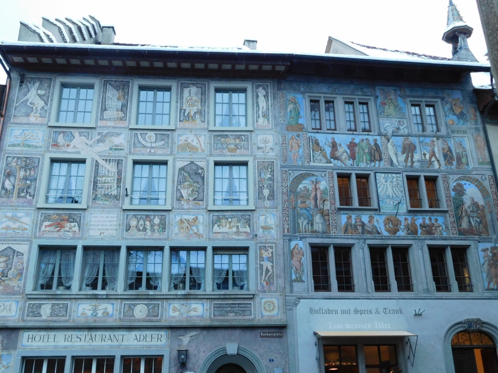 The town of Stein am Rhein doesn’t have much to offer – everything kind of boils down to the main street and the square. But... it’s all so beautiful, fairy-tale-like and picturesque, that it was no trouble for me to walk through it again and take more photos. I also explained this to myself by the fact that it was late afternoon, so there was less natural light, while the artificial lights in the shops had turned on, which only added to the picturesque atmosphere. Considering the remnants of snow and the low temperature outside, those lights from the shops further inspired me, creating the impression that there was a fire burning inside and that one could warm up nicely there. Very primal impressions indeed!