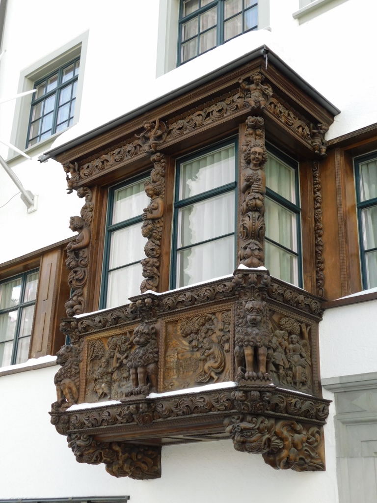 A couple of the buildings are well-known enough to have their official names. One of them is the “At Griffin House” (Haus zum Greif) from the second half of the 19th century, featuring a spectacularly beautiful bay window.
