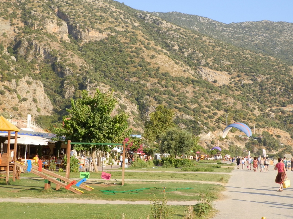 As it can be seen, parallel to the beach and the pedestrian path/landing strip for paragliders, there is a wide lawn, followed by a row of restaurants. Behind that, the town spreads out with hotels, restaurants, shops, and everything else needed for a vacation and tourism.