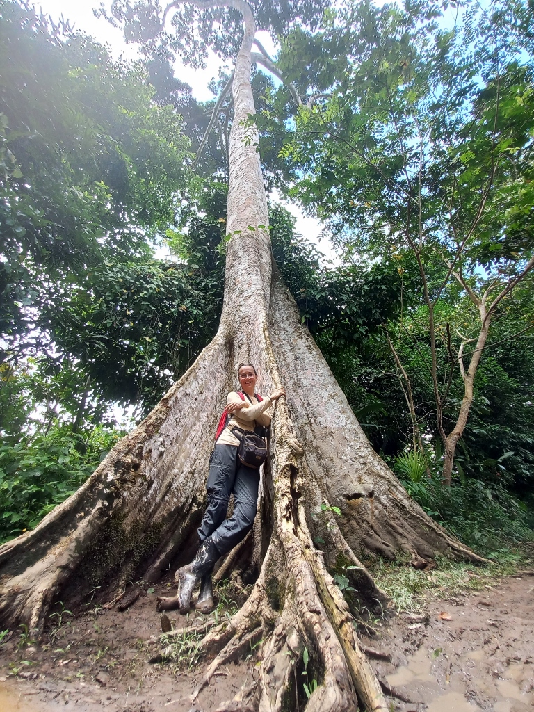 Kada već pominjem drveće, evo dve zanimljive vrste. Jedno je seiba ili kapok, a zovu ga i svileno-pamučno drvo (Ceiba pentandra). Ja sam ovo drvo više puta pominjala u okviru svojih putopisa, ali je ono uvek impresivno. Između ostalog i zato što može da naraste do visine od oko 73 m, prečnik stabla mu ide do 3 m, a takođe ima i impresivne potporne korenove. Ovom prilikom sam se slikala baš kod tih potpornih korenova i ove fotografije daju predstavu o veličini jedne prosečne seibe.