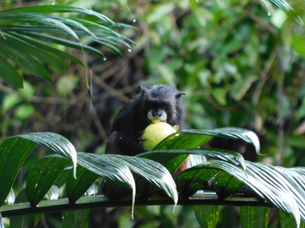 Kada se kiša malo smirila, neko je ugledao veoma zanimljivu malenu životinju koja je u blizini na jednom drvetu jela neko voće. Bilo je teško da se snimi, jer se životinjica stalno pomerala, ali zato je dovoljno dugo boravila u okolini da sam mogla da napravim više fotografija. U pitanju je crnoleđi tamarin (Leontocebus nigricollis).