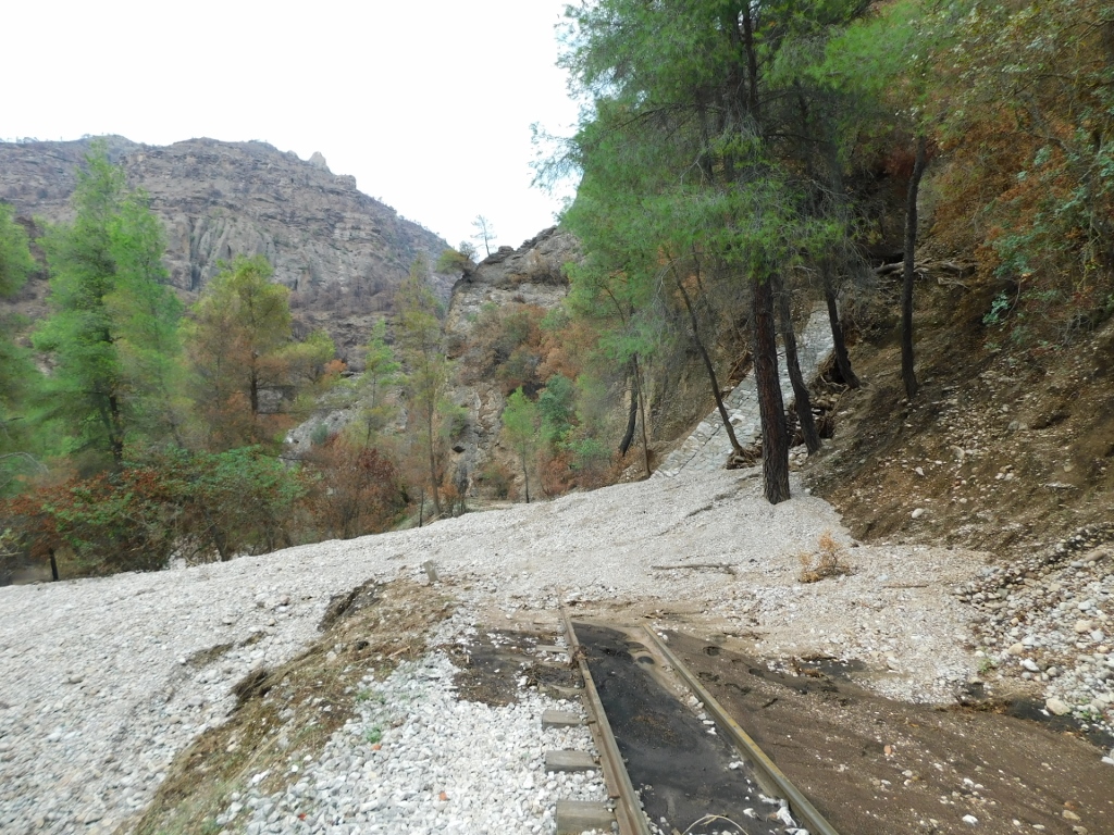 Međutim, ono što je ovde bilo najupadljivije bile su posledice velikih kiša koje su padale prethodnih dana. U pitanju su bili brojni odroni koji su u većoj ili manjoj meri prekrivali prugu. Mislila sam kako je sigurno i onaj požar, od godinu ili dve ranije, dao svoj doprinos ovakvom razvoju događaja, jer je sada drveće uglavnom mrtvo i ne upija dovoljnu količinu vode iz zemljišta, niti je njegovo korenje više dovoljno jako da bi zadržalo zemlju i kamenje, i sprečilo da oni klize.