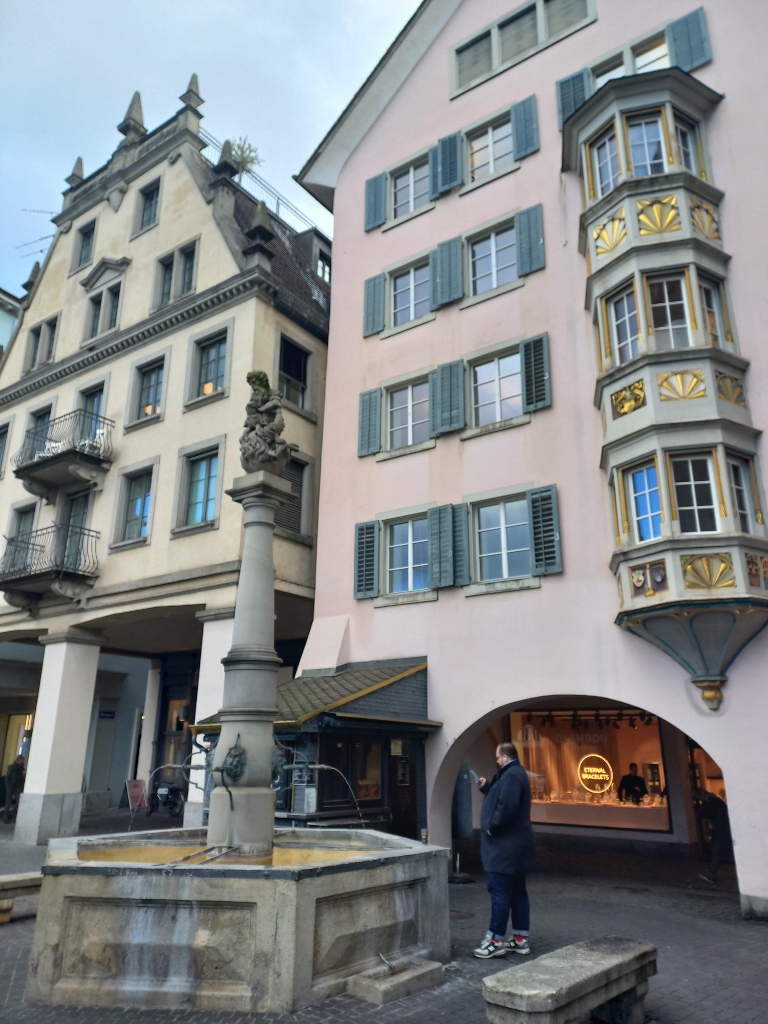 Umesto toga sam se spustila do poznatog trga pored zapadne obale reke Limat koji se zove Vajnplac. Na trgu se posebno ističe veoma lepa česma na kojoj se nalazi figura vinogradara koji nosi svoju korpu sa grožđem.