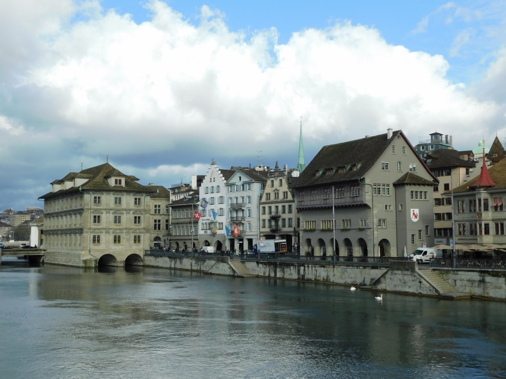 Kada se pređe most, lepo je i da se krene šetalištem duž zapadne obale reke, makar malo, jer se odatle ponovo pruža lep pogled na delove Ciriha. Na sledećoj fotografiji se dobro vidi i impozantna katedrala, kao i Helmhaus.