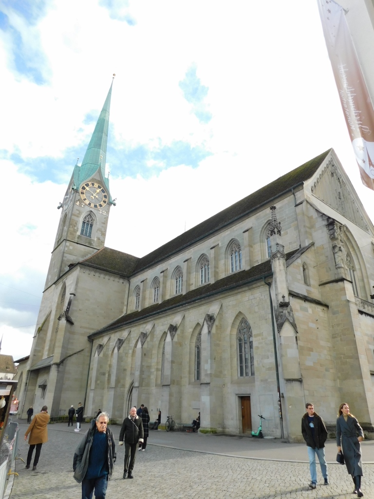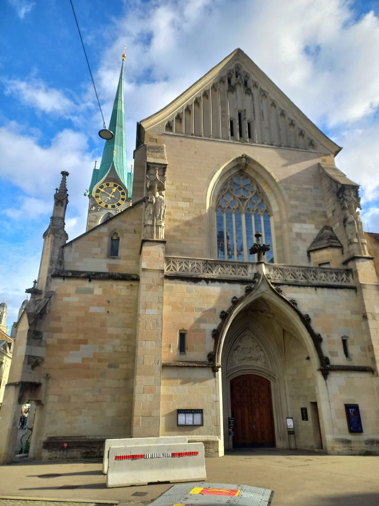 Zatim sam se spustila do glavne ulice, ali pre nego što sam prešla preko Minsterbrikea, mosta koji praktično spaja katedralu Grosminster i još jednu važnu crkvu Frauminster, otišla sam da pogledam još jednu crkvu koja je podignuta između reke i ulice, pa se valjda zato i naziva Vodena crkva ili Vaserkirhe. Zapravo je prvobitna crkva podignuta u XIII veku na malenom ostrvu na reci Limat, ali je vremenom (1839) ostrvo spojeno sa kopnom. Crkva je u potpunosti rekonstruisana u XV veku i ta građevina može danas da se ovde vidi.