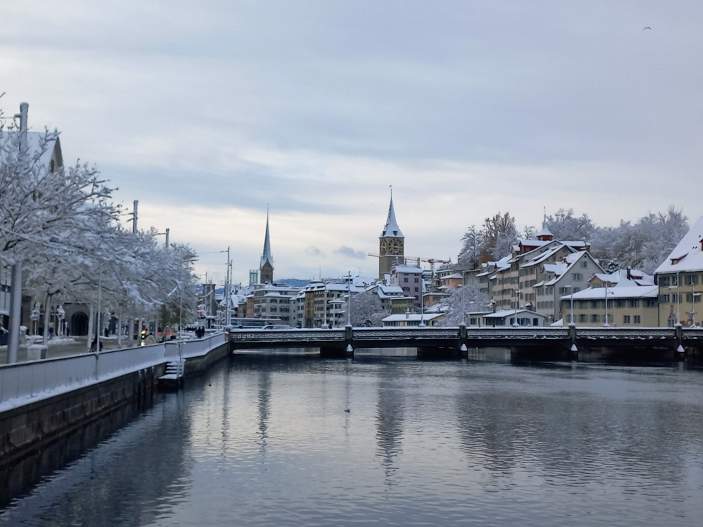 Najjednostavniji i najdirektniji put do stanice je vodio mostom za pešake preko reke Limat u Cirihu, a kako je prethodnog dana napadao sneg, tako su prizori bili veoma lepi.