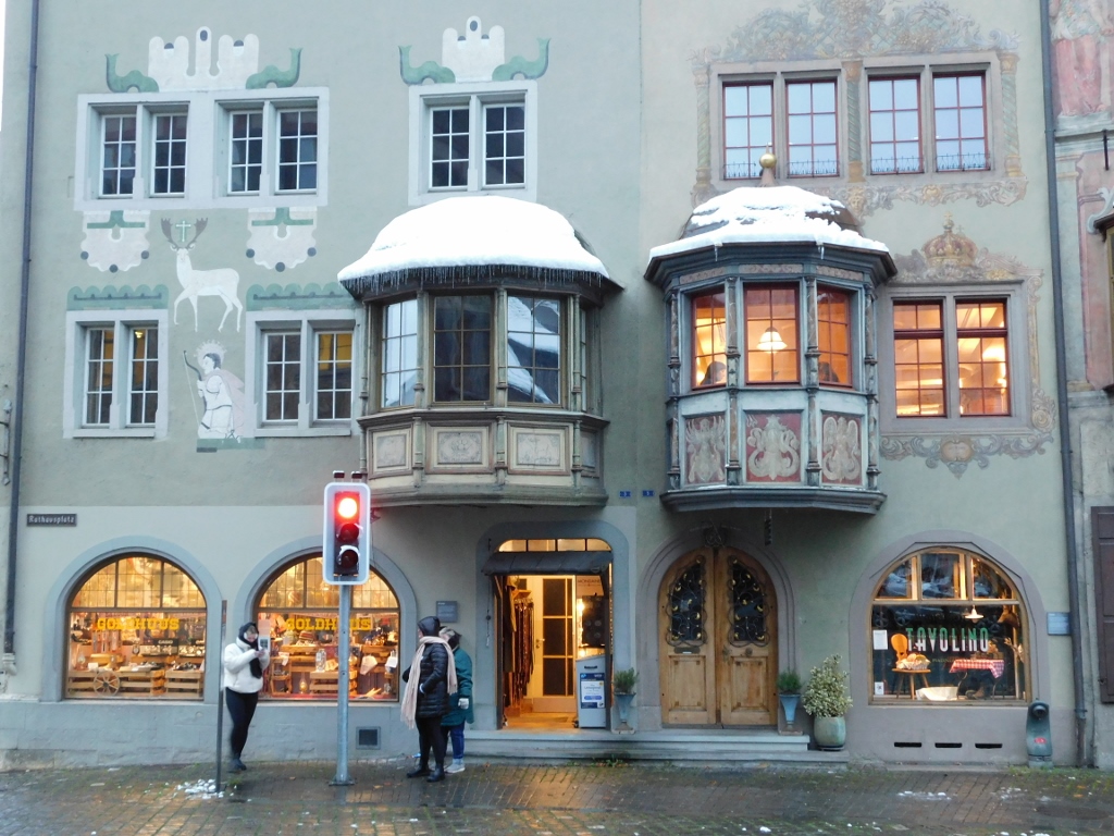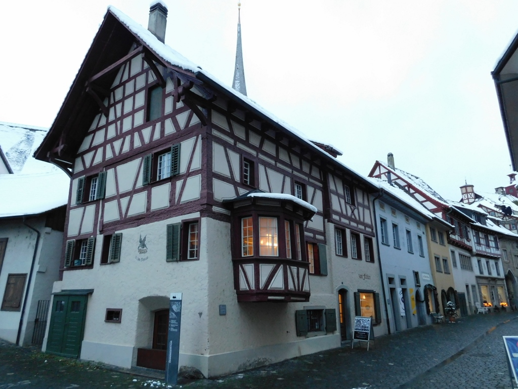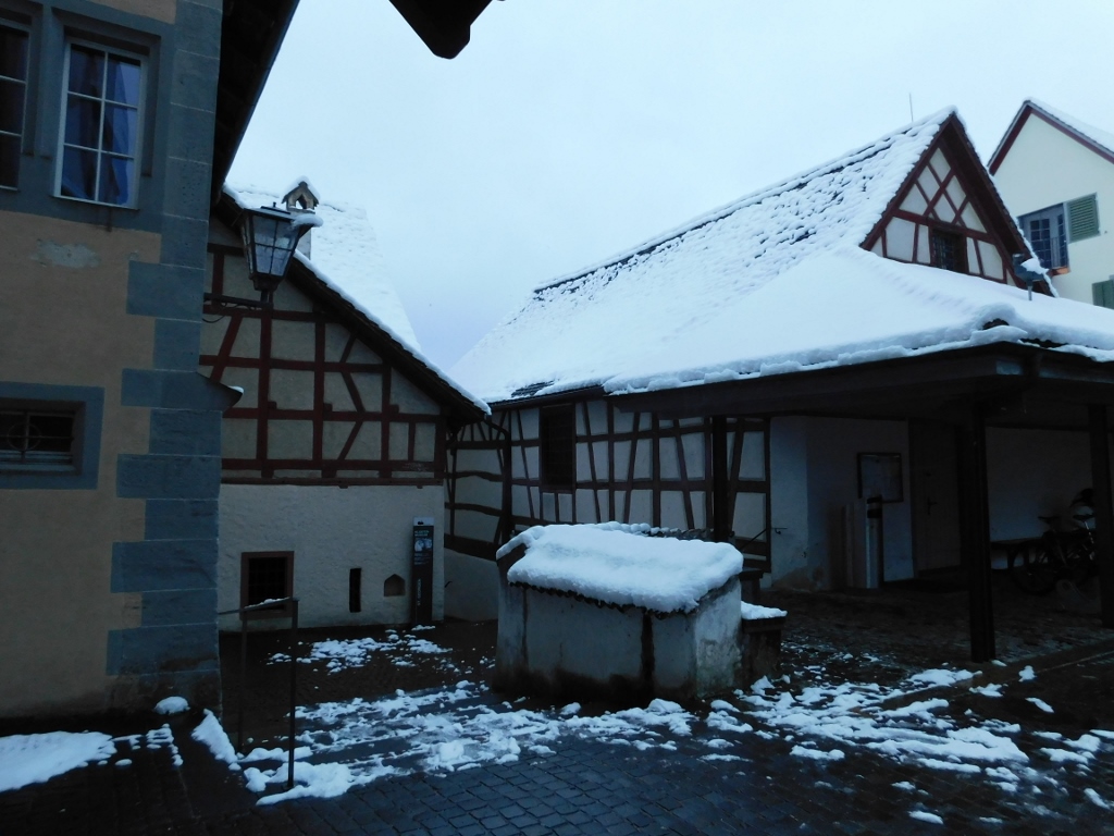 Gradić Štajn am Rajn nema previše toga da ponudi – sve se nekako svodi na tu glavnu ulicu i trg. Ali... To je sve toliko lepo, bajkovito i slikovito, da meni ni najmanje nije bilo teško da ponovo tu prođem i fotografišem. To sam sve sebi dodatno objašnjavala time da je sada kasno popodne, pa je manje prirodne svetlosti, a pale se veštačka osvetljanja po radnjama, što samo još više doprinosi slikovitosti. Imajući u vidu ostatke snega i nisku temperaturu napolju, ta svetla iz radnji su dodatno inspirisala stvarajući utisak da unutra gori vatra i da tu čovek može fino da se ogreje. Vrlo primalni utisci!