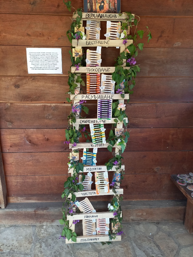 Posebno mi je bilo zanimljivo kada sam ovde videla lestvice pored kojih je tekst koji citira nekoliko stihova iz duhovnih knjiga, a koji svi upućuju da se prema Bogu ide na gore. Tako na lestvicama mogu da se vide različiti stepeni na putu ka Gospodu: