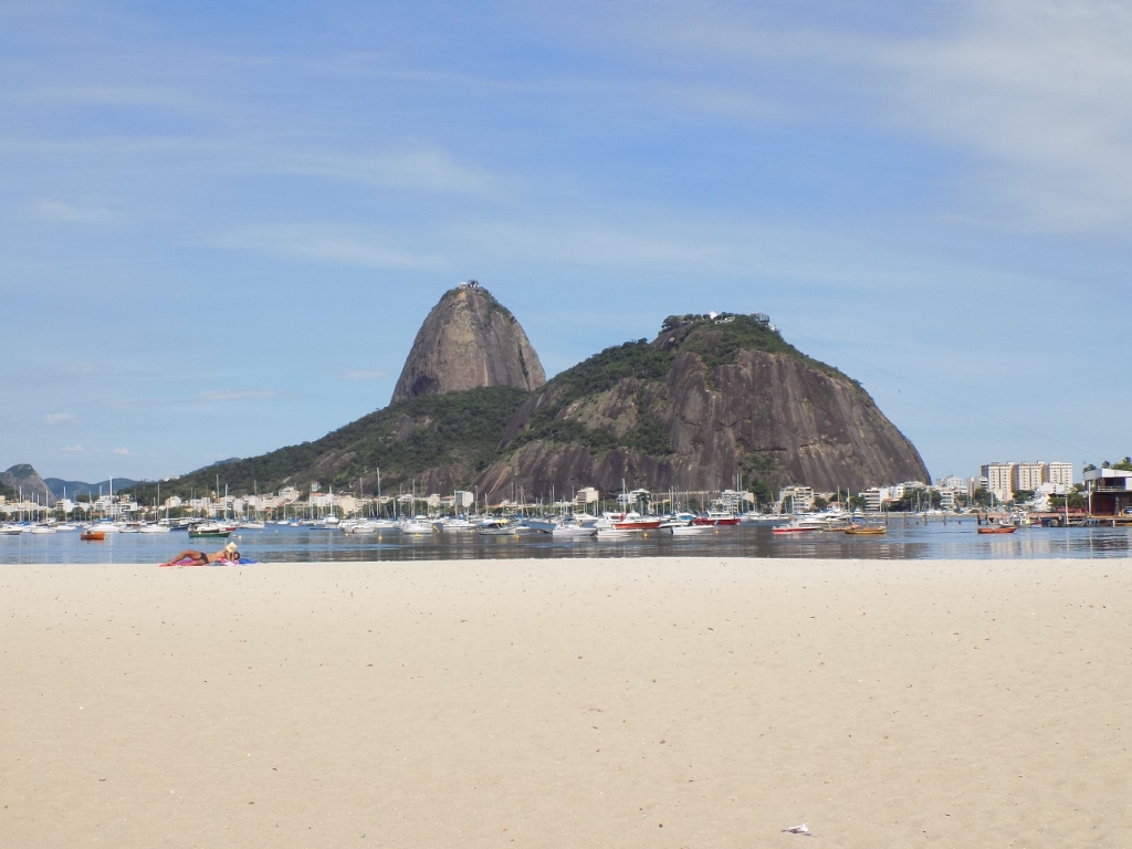 Onda smo otišle do plaže koja pripada kvartu Botafogo, ali se ona zapravo uopšte ne koristi kao plaža. Bilo mi je jasno zašto kada sam stigla do ivice vode. Voda deluje gotovo masno i muljevito, jer je u tom zalivu velika marina sa čamcima. Doduše na ogromnoj plaži sam videla par ljudi koji su se sunčali i to je bilo to. Nije mi bilo jasno kako su mogli da tu leže pošto mi se činilo neverovatno vrelim, ali je dolazak na ovu plažu apsolutno bio vredan truda i trpljenja sunca koje je peklo zbog predivnog pogleda na Glavu šećera.
