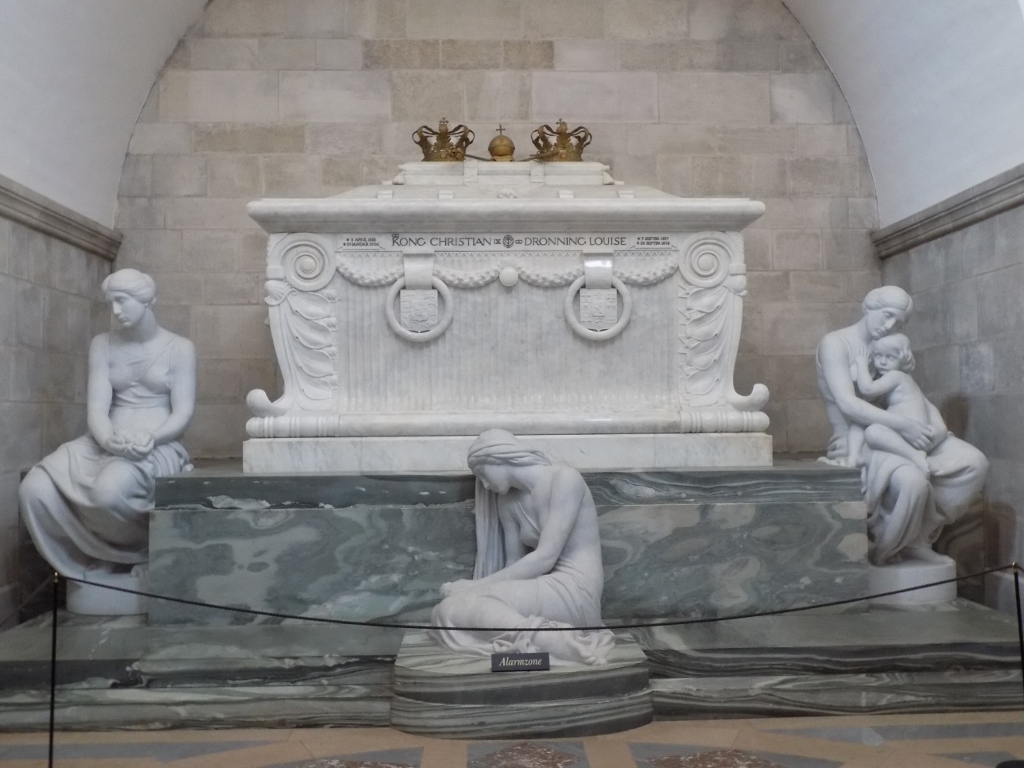 U prostranoj grobnoj kapeli sa leve strane, nalazi se nekoliko sarkofaga. Ne želim sada da ulazim u detaljnu priču o svim danskim vladarima koji su sahranjivani po kapelama, ali mi je posebno zanimljiv praktično trivijalni podatak u vezi sa skulpturama pored sarkofaga Kralja Kristijana IX i njegove supruge Luize. Naime, ove tri skulpture žena simbolizuju Sećanje, Ljubav i Duboku tugu, a njihov autor je Edvard Eriksen, isti onaj koji je uradio i Malu sirenu koja se nalazi u Kopenhagenu. Trivijalni podatak koji pominjem jeste da je vajar kao model za ove tri skulpture koristio svoju ženu, a isto je uradio i u slučaju Male sirene, pa se ova tri ženska lika zovu sestrama Male sirene.