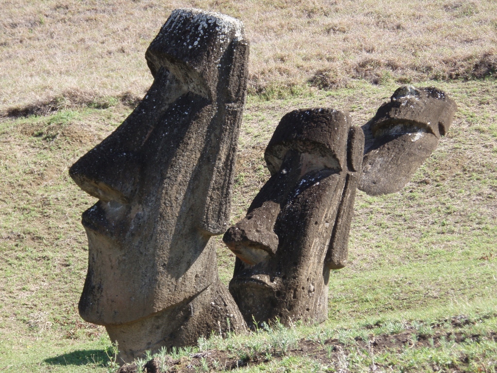 Near Ahu Tongariki there is a grassy elevation which eventually extends into a cliff. That is Rano Raraku, called the nursery. This is the place where the moai used to be made, i.e., where they were chiselled out of the rocks and nowadays there is a myriad of apparently scattered and simply completed, but untransported moais. Some, however, have never been completed.