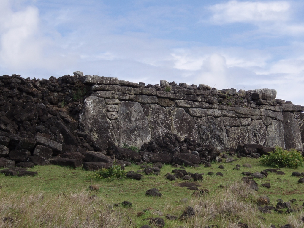 By the way, in addition to the platform on which the moais are places, an ahu often incorporates another slightly broader and lower sloping platform made of smaller stones with larger, round stones arranged on top of them.