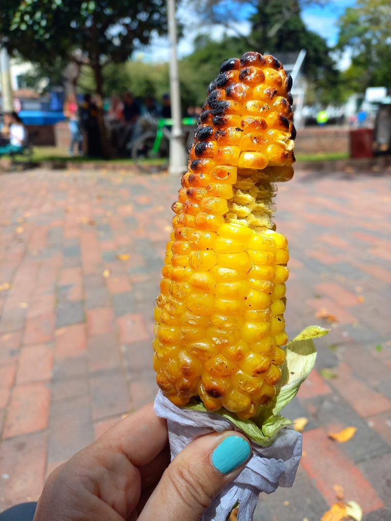 Speaking of food, I got inspired to try their roasted corn, which was sold in several places. It was good to try it, but I was not overly impressed because this was a very tough variety. Although corn (maize) originates from the Americas, over time much tastier and less tough varieties have been developed where I'm from. To eat this one in Usaquén peacefully without worrying it might slip from my hands, I sat comfortably on a bench in the park and, since I have good teeth, I managed to finish it there in the end.
