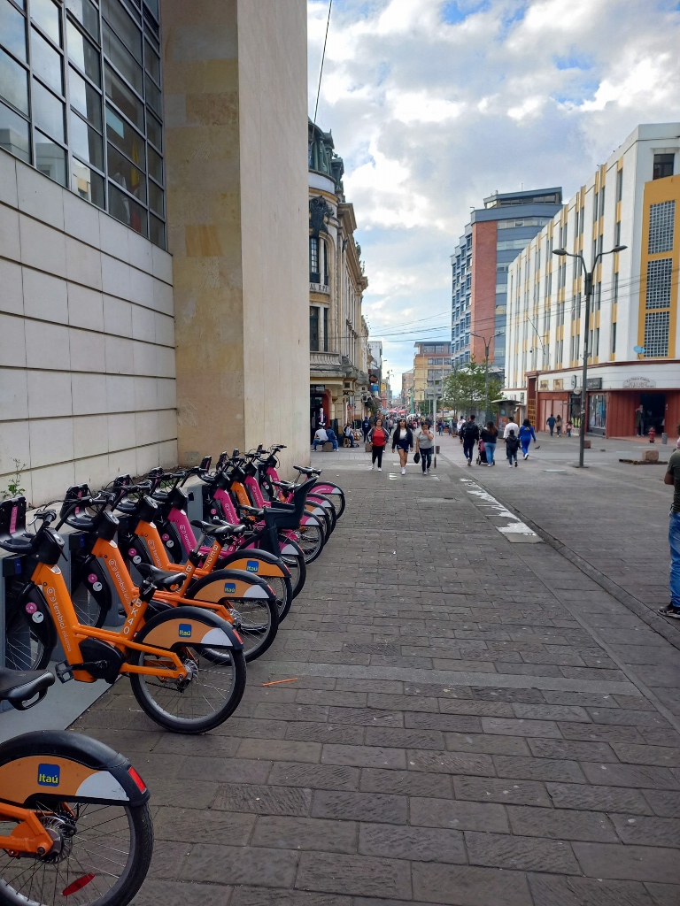 By the way, if any visitors are wondering how to ride a bike around Bogotá on Sundays, here's a possible solution. I later captured this scene in downtown Bogotá, while these rental bikes are surely available at many different locations.