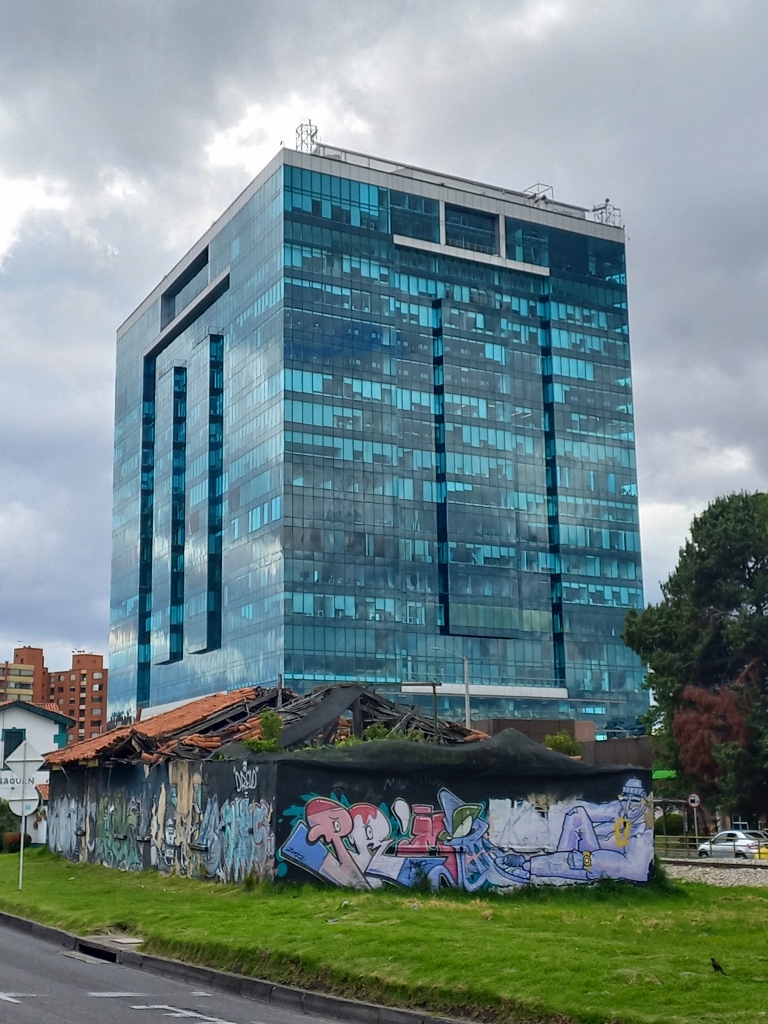 However, I was now ready to return to the centre of Bogotá, so I called Uber again. I had to wait a bit, so I captured more interesting scenes along the way. In the next photo, you can see another modern building alongside an old house in a state of decay.