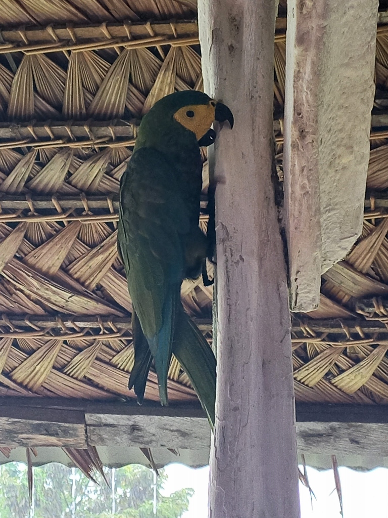 The video recording also shows a parrot perched on the railing near the neighbouring table. In fact, there were two of them belonging to two different species and they would occasionally fly off only to circle around and return. This gave me the opportunity to capture them on camera. In the next photo, on the left is the festive parrot (Amazona festiva), while on the right is the red-bellied macaw (Orthopsittaca manilatus).